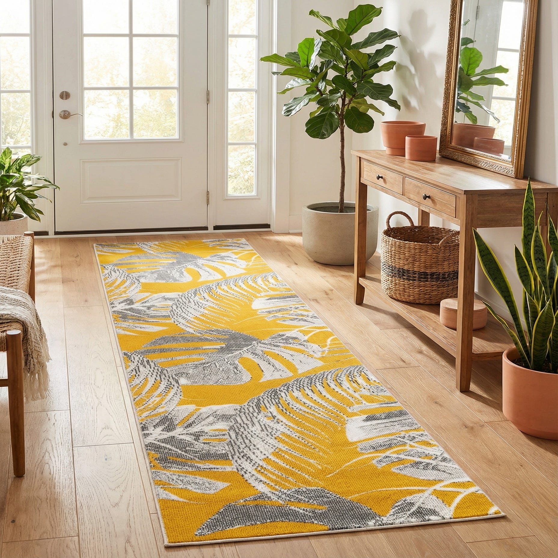 A vibrant 8 ft runner rug featuring a modern botanical pattern with large white and gray tropical leaves on a bright yellow background.