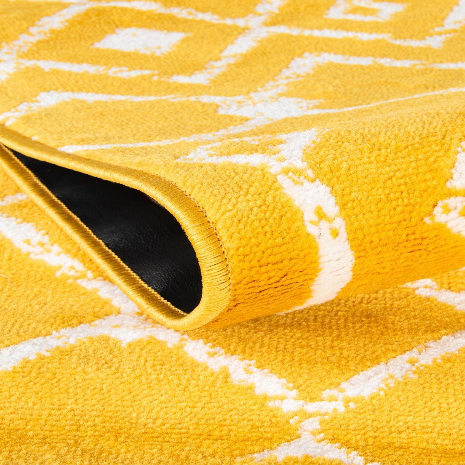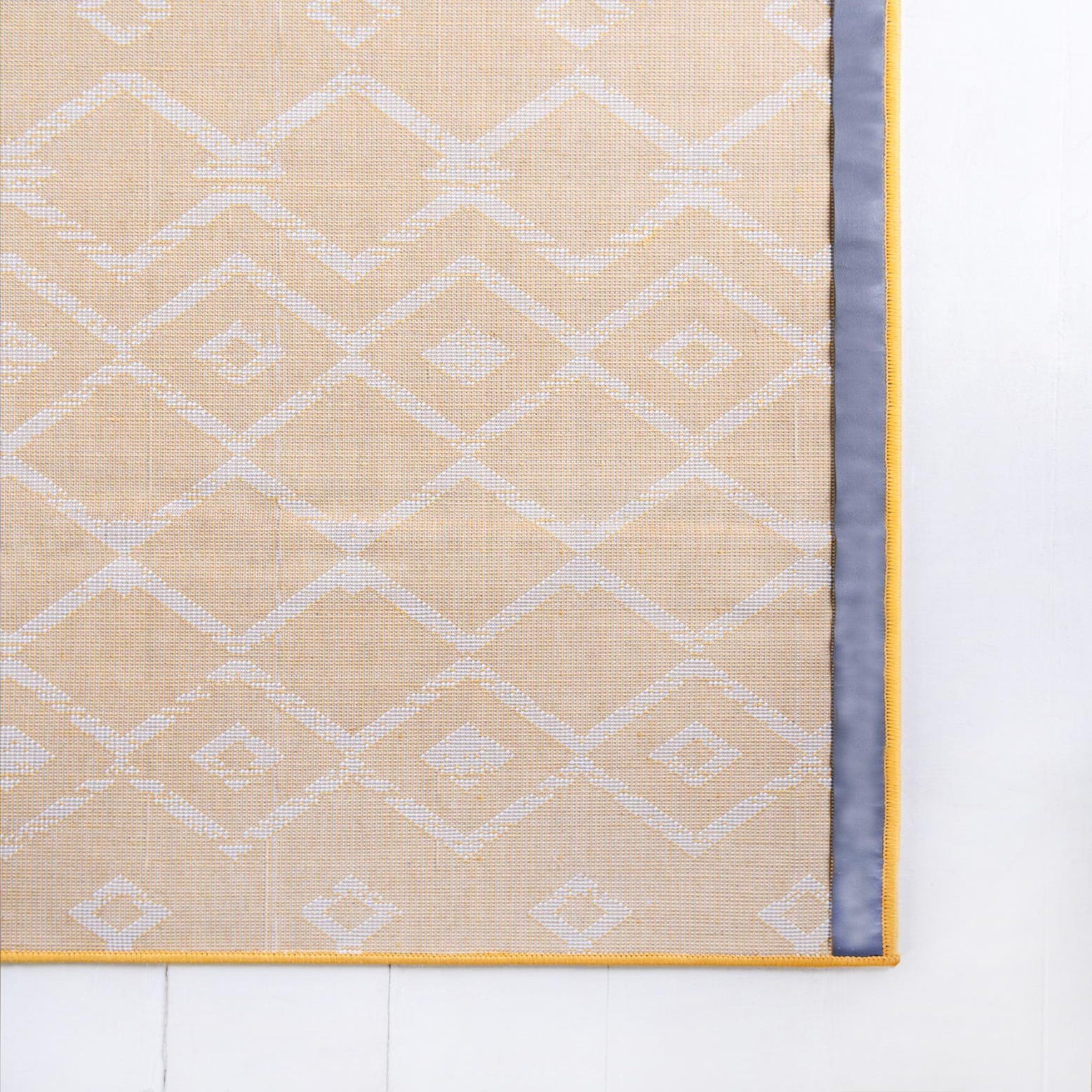 A warm yellow field sets the stage for a repeating ivory trellis and diamond motif with lightly distressed edges that give the pattern a relaxed, hand-crafted feeling. The design alternates rows of geometric diamonds and elongated vertical accents for visual movement along the runner. Machine-made from 100% polypropylene, the rug has a low, dense pile that feels soft underfoot while retaining a clean, defined texture.