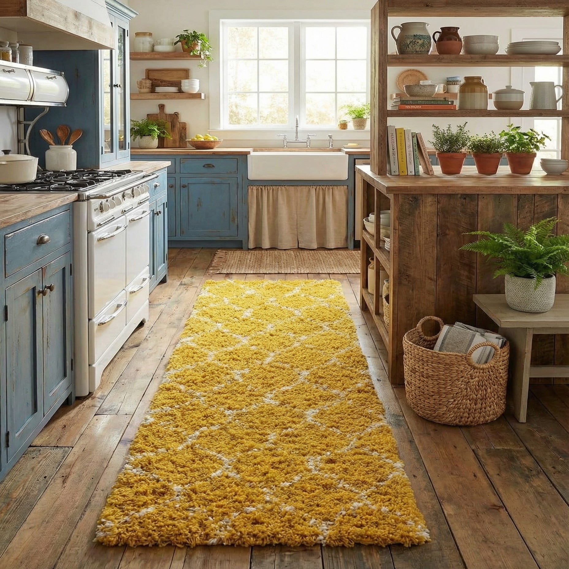 This runner works well in a bright hallway or narrow entry where a pop of color is welcome, and it layers easily in a galley kitchen or along the side of a bed to add warmth underfoot. Pair it with light wood floors and white or gray walls for a clean, contemporary feel, or combine it with wicker and natural fibers for a relaxed, boho-inspired look. The yellow and ivory palette also complements mid-century modern accents and crisp, coastal interiors.