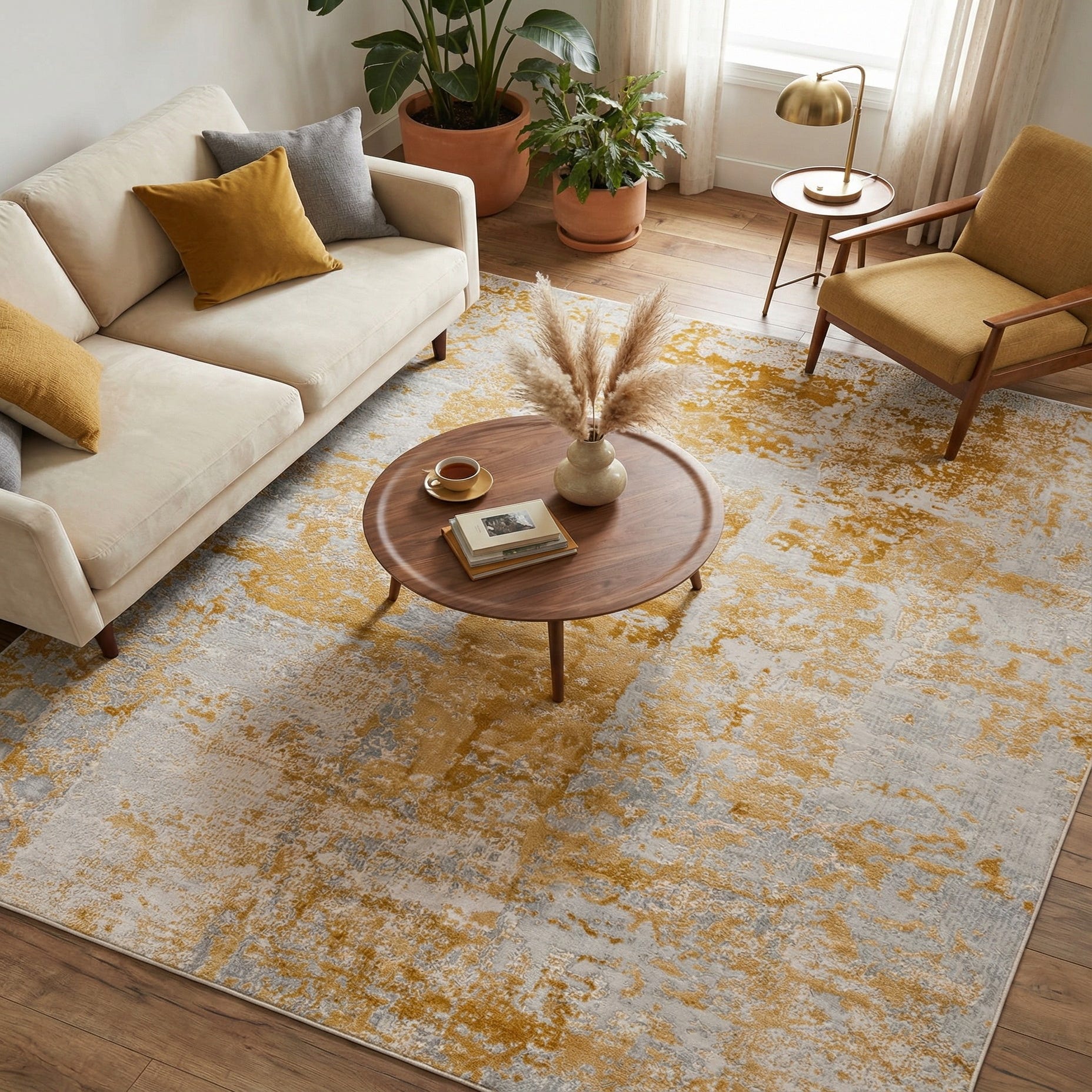 A contemporary abstract rug with a painterly, distressed pattern that layers warm yellow as the background with soft gray and ivory accents. The design combines broad, irregular blocks and weathered, almost brushstroke-like textures to create visual depth without a repeating motif. Machine made from 60% polypropylene and 40% polyester, the surface has a low-pile feel with a subtle, velvety sheen and gentle variation in texture where the colors overlap—comfortable underfoot while still laying flat in a seating area.