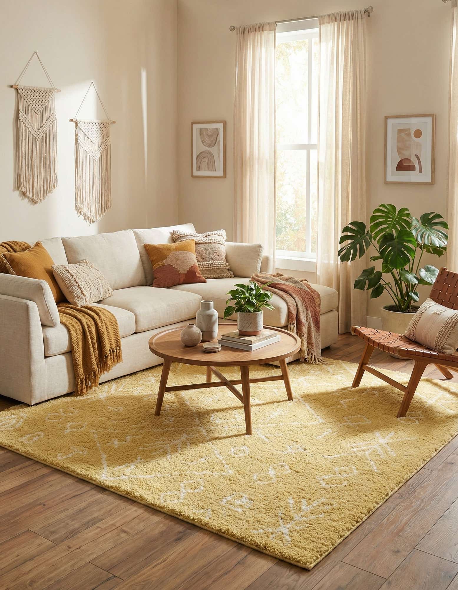 Primary color is Yellow. Colors in this rug include: Yellow, Ivory.