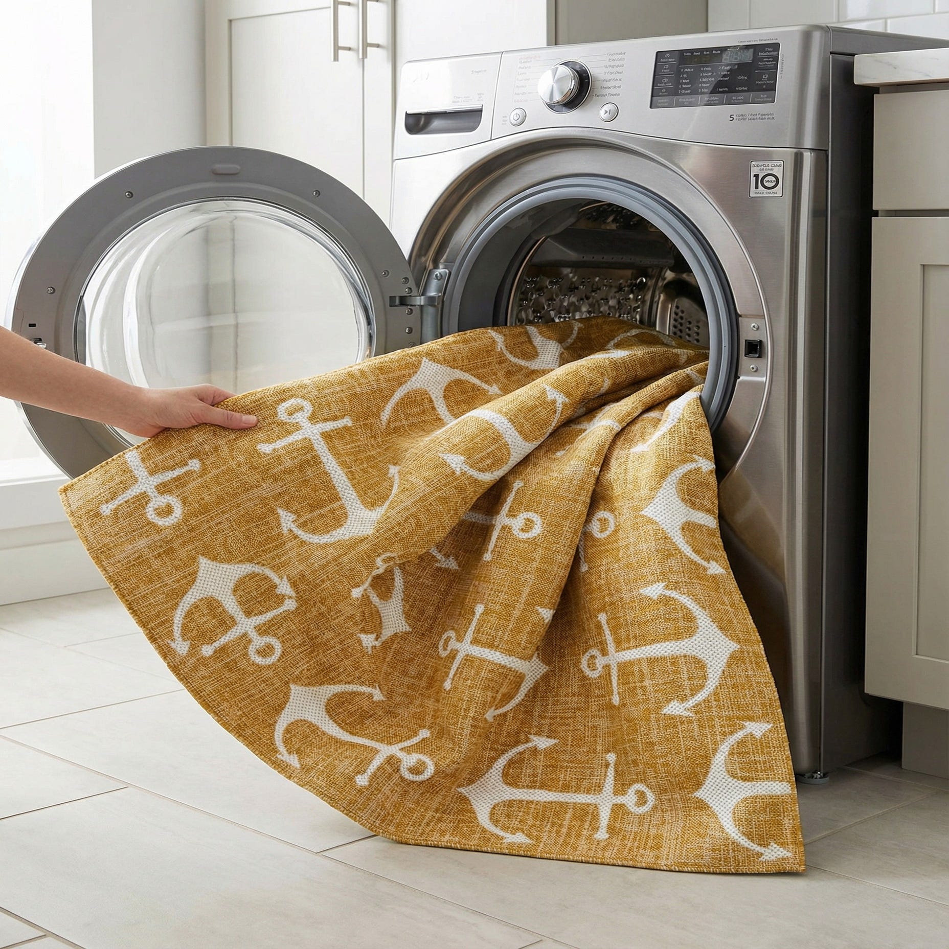 A square yellow indoor/outdoor rug with a repeating pattern of white anchors, perfect for a patio or beach-themed room.