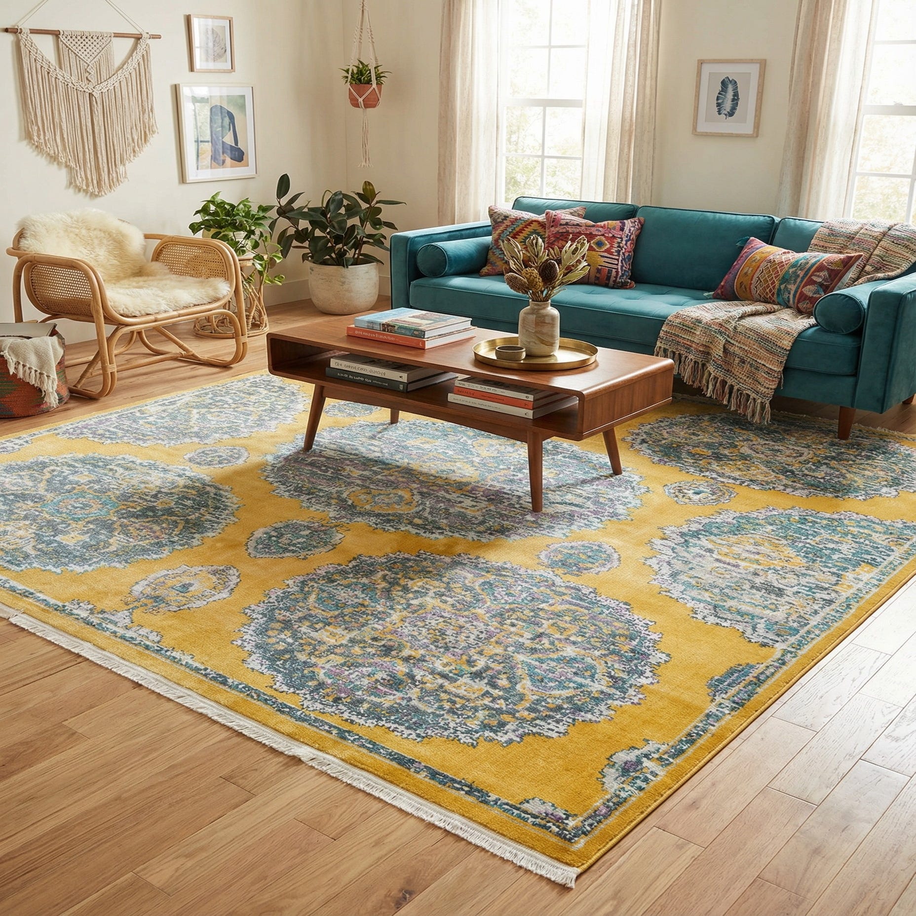Machine-made from 100% polypropylene, the rug’s low-to-medium pile has a smooth, slightly plush hand that compresses easily underfoot and quickly rebounds. The surface feels consistent and comfortable, making it a practical choice for high-traffic living areas. Style pairings that work particularly well include mid-century modern rooms with warm wood tones, eclectic bohemian spaces layered with textured textiles and jewel accents, or contemporary neutral interiors where the yellow ground brings a needed dose of color and pattern.
