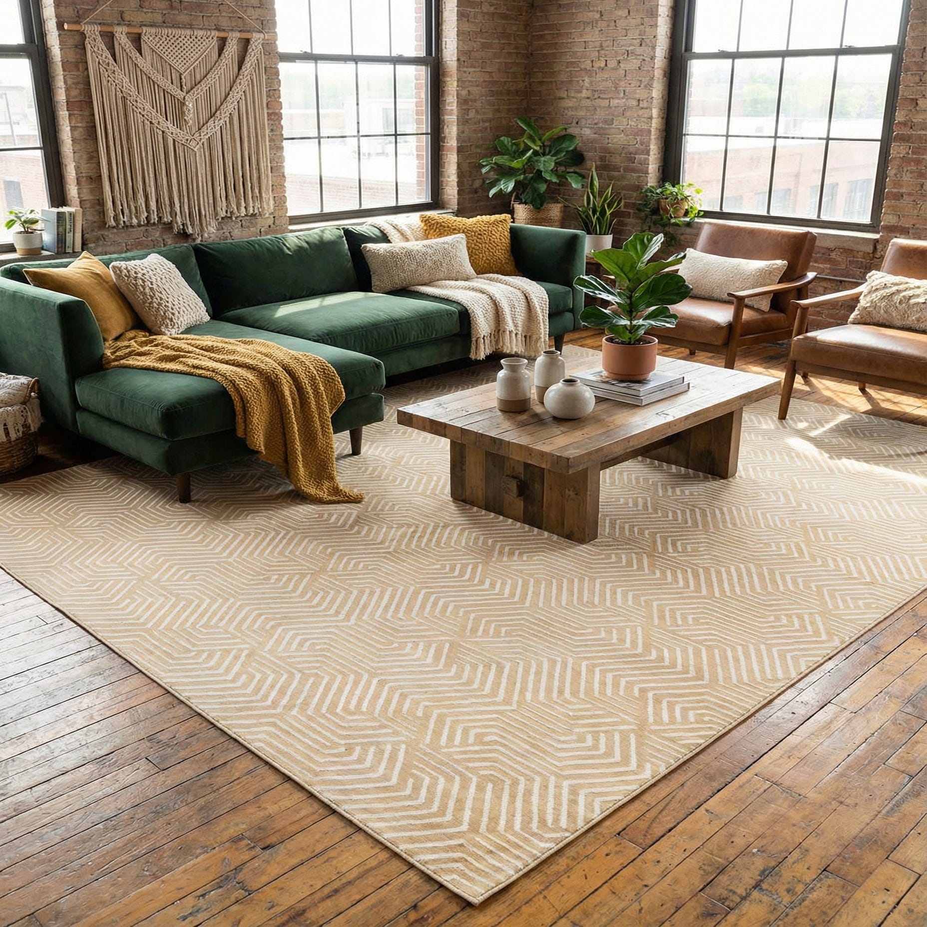 This rug works well in contemporary and mid-century inspired interiors—place it under a streamlined sofa to anchor a seating area or layer it in a sunny breakfast nook to add color and pattern. It complements light woods, ivory upholstery, and brass or matte black accents, and pairs nicely with natural textures like linen, rattan, or leather to create a warm, balanced room.
