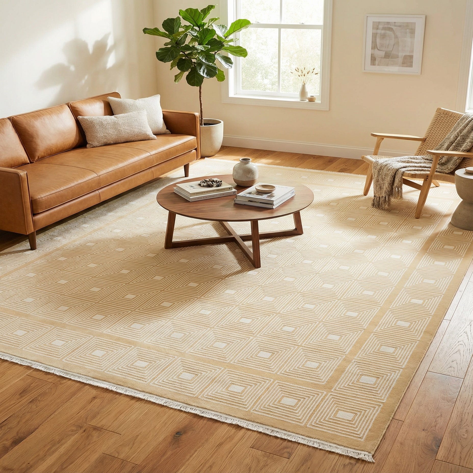Place this rug to anchor a living room seating group, brighten a dining area beneath a natural-wood table, or add pattern and warmth to a sunlit bedroom. It pairs well with light woods and neutral upholstery, and looks equally at home alongside matte brass or black metal accents for contrast; layer in textured throws or woven accessories to balance the graphic geometry with a cozy feel.