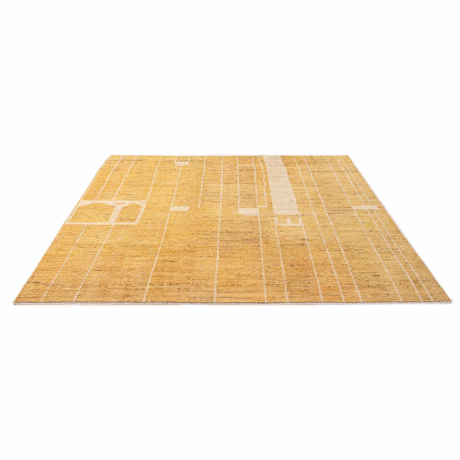 A rectangular 8x10 Darya Collection wool rug in shades of yellow and gold with a modern abstract design.