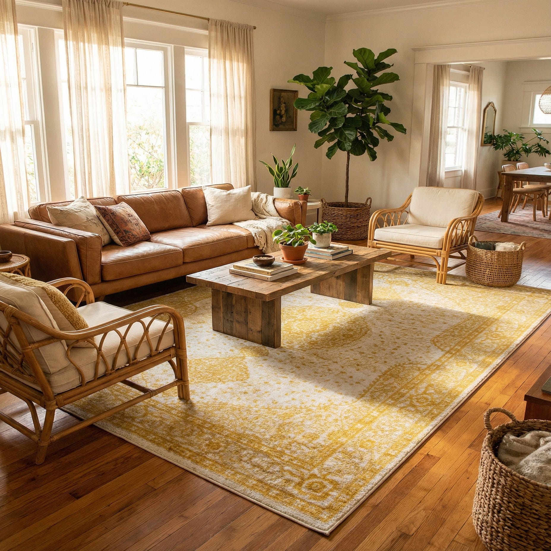 Machine-made of 100% polypropylene, the rug has a low, dense pile that feels smooth underfoot and stays low-profile under furniture. Its durable, color-rich weave makes it an easy choice for living rooms, entryways, dining areas, or sunlit bedrooms. Pair it with light wood furniture, white or neutral upholstery, and natural linens for a fresh, modern-farmhouse or transitional look, or use it to introduce a warm pop of color into Scandinavian and mid-century modern spaces.