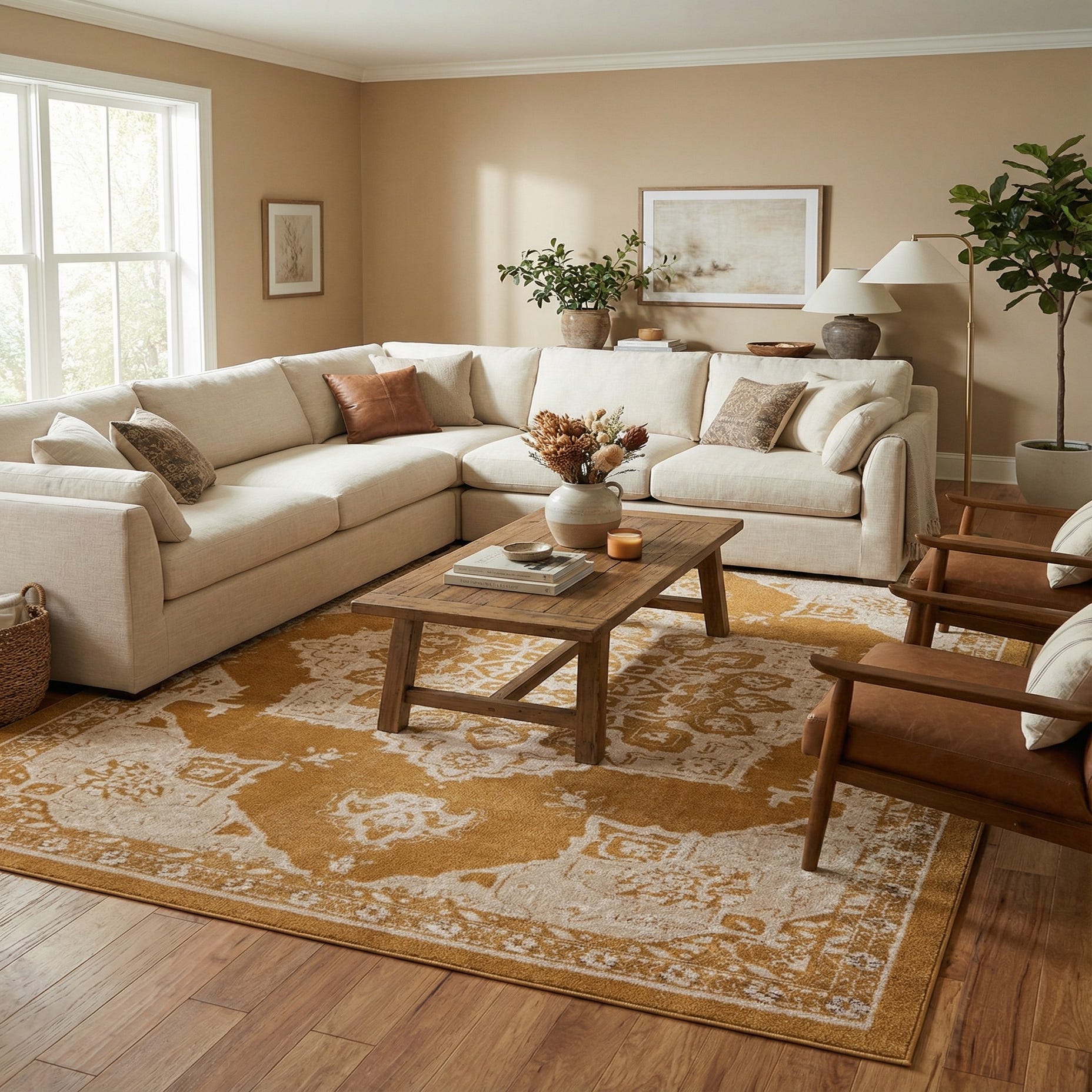 This rug pairs well with warm wood finishes, brass or gold accents, and neutral upholstery in beige or ivory to let the yellow ground bring a sunny, grounded presence to the room. Place it under a living room coffee table to anchor seating, layer it beneath a dining table to add pattern without overpowering, or use it in a bedroom to introduce color and texture. Its classic, slightly worn aesthetic complements transitional, farmhouse, and eclectic interiors where classic patterning and warm tones are desired.