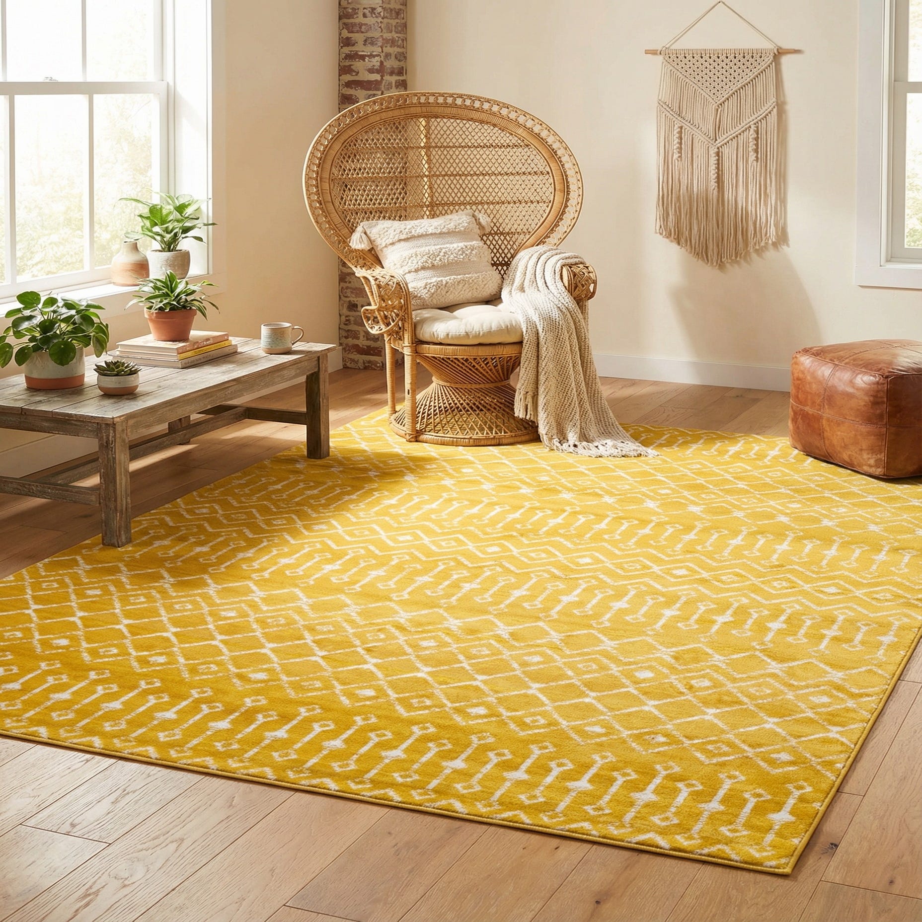 A lively geometric trellis runs across a sunny yellow field, its ivory motifs arranged in alternating bands of diamond lattices and elongated key-like shapes. The repeating pattern has a hand-drawn quality that gives the design a casual, modern-bohemian feel while staying clean and structured enough for transitional interiors. The yellow background brightens a room without overwhelming, and the ivory pattern provides crisp contrast that defines the rug’s graphic personality.
