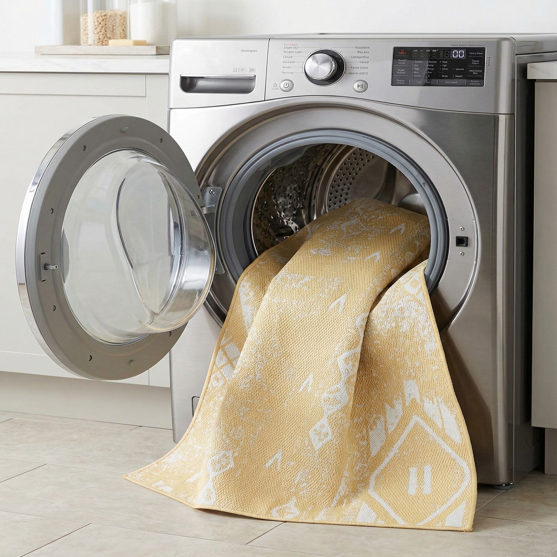 This rug works well on covered patios, sunrooms and balconies where a bright, cheerful foundation is desired, and it translates easily into casual indoor spaces like a kitchen nook or family room. Pair it with natural wood or rattan furniture, ivory or white linens, and textured throw pillows for an inviting boho vignette, or combine it with navy and gray accents for a modern-eclectic contrast.