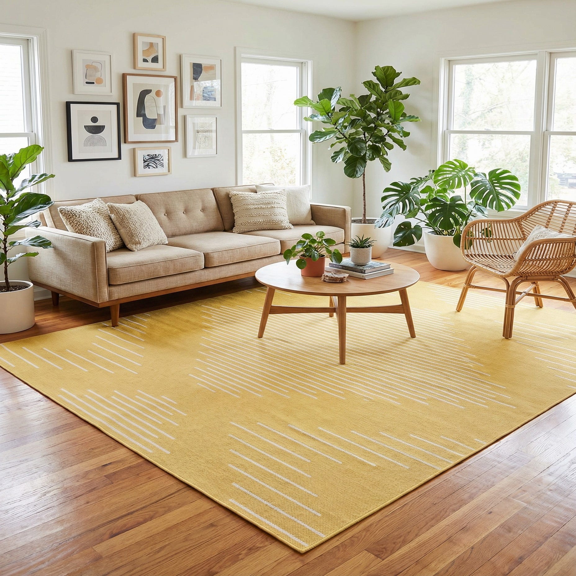A rectangular 8x10 yellow area rug with a modern Southwestern pattern of white horizontal stripes forming large diamond shapes.