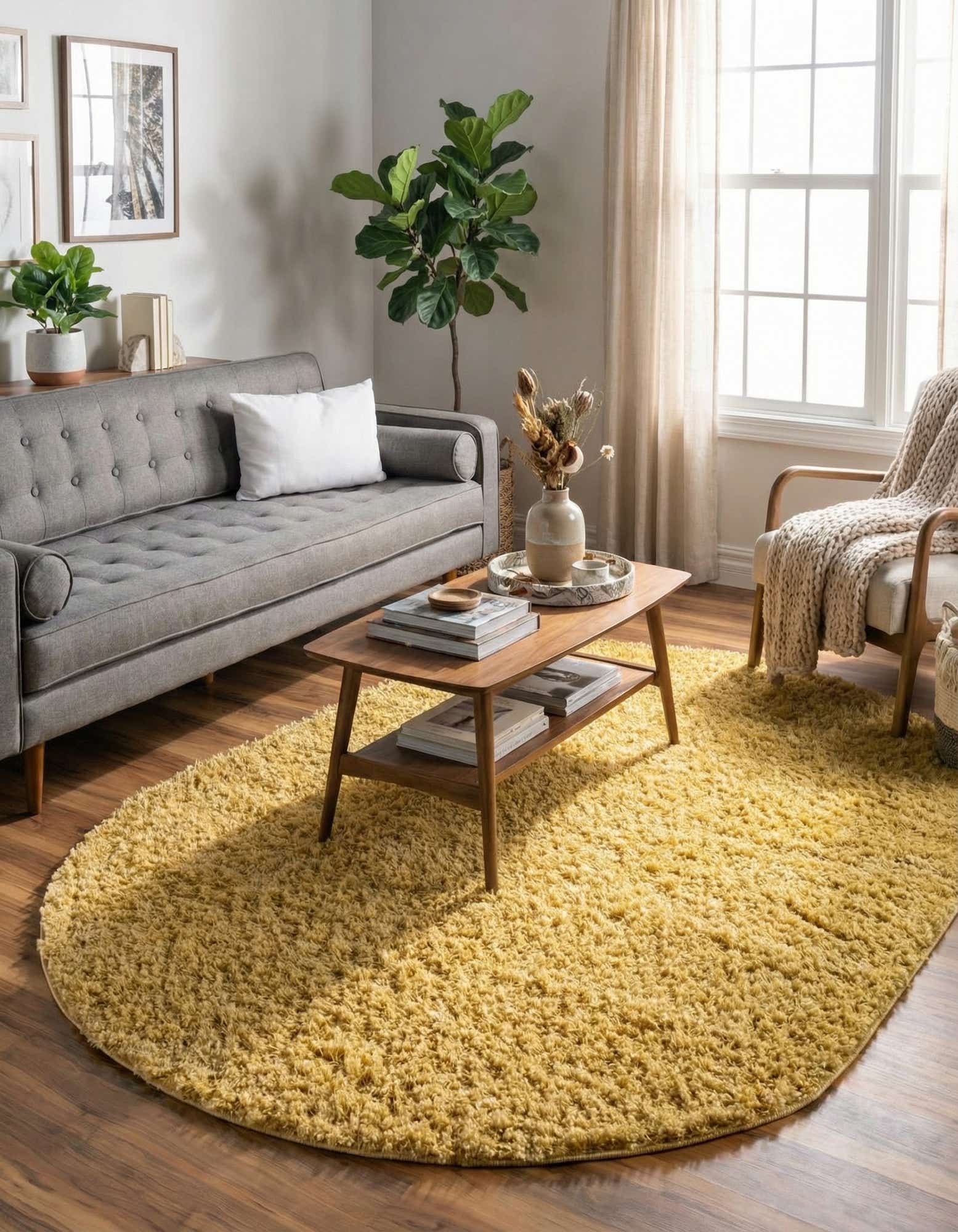 Solid yellow in an oval silhouette, this shag rug offers a clean, unpatterned look with a deep, plush pile you can feel. Machine-made from 100% polypropylene, the dense yarns create a soft, textured nap with a slight sheen that changes with the light and touch. The simple, single-color design and generous pile bring visual warmth and a tactile layer to the floor without competing with other patterns.