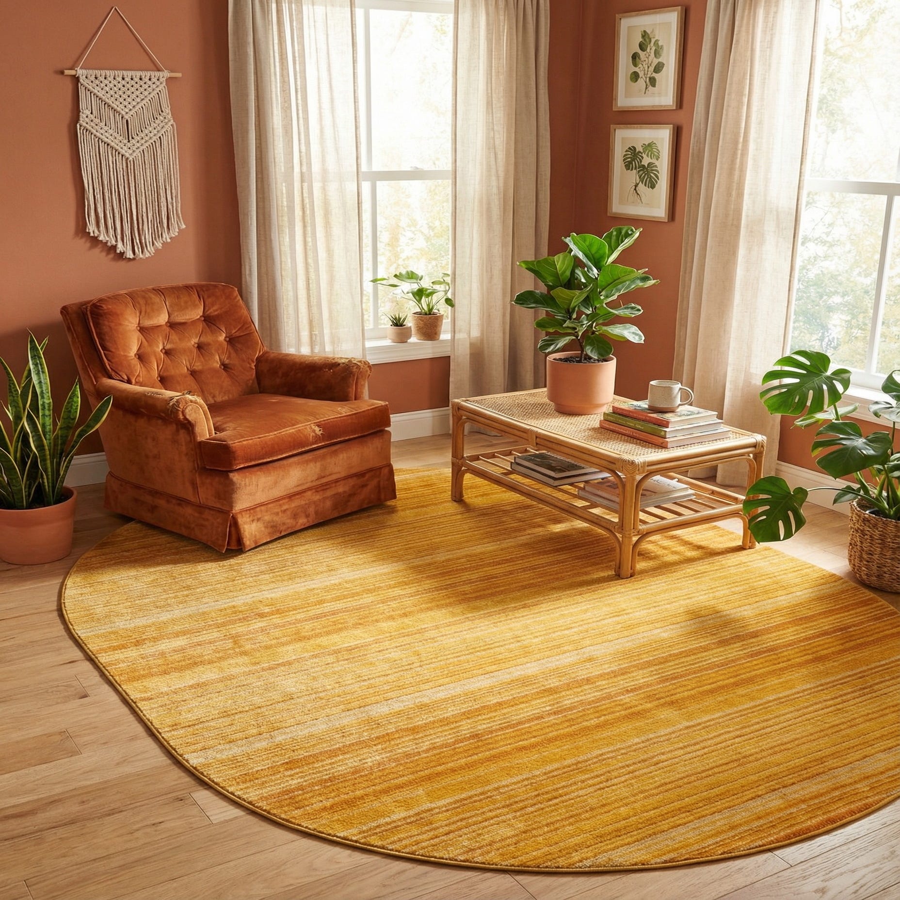 A warm yellow ground is threaded with narrow, tonal orange stripes that run horizontally across the oval profile, creating a calm, linear pattern with subtle variation in shade. Machine-made from polypropylene, the surface has a low, dense pile with a soft, velvety hand and a slight sheen that gives the color depth when you brush your fingers across it. The striped motif reads modern and restrained, with the orange accents bringing a measured warmth without overwhelming the overall yellow field.