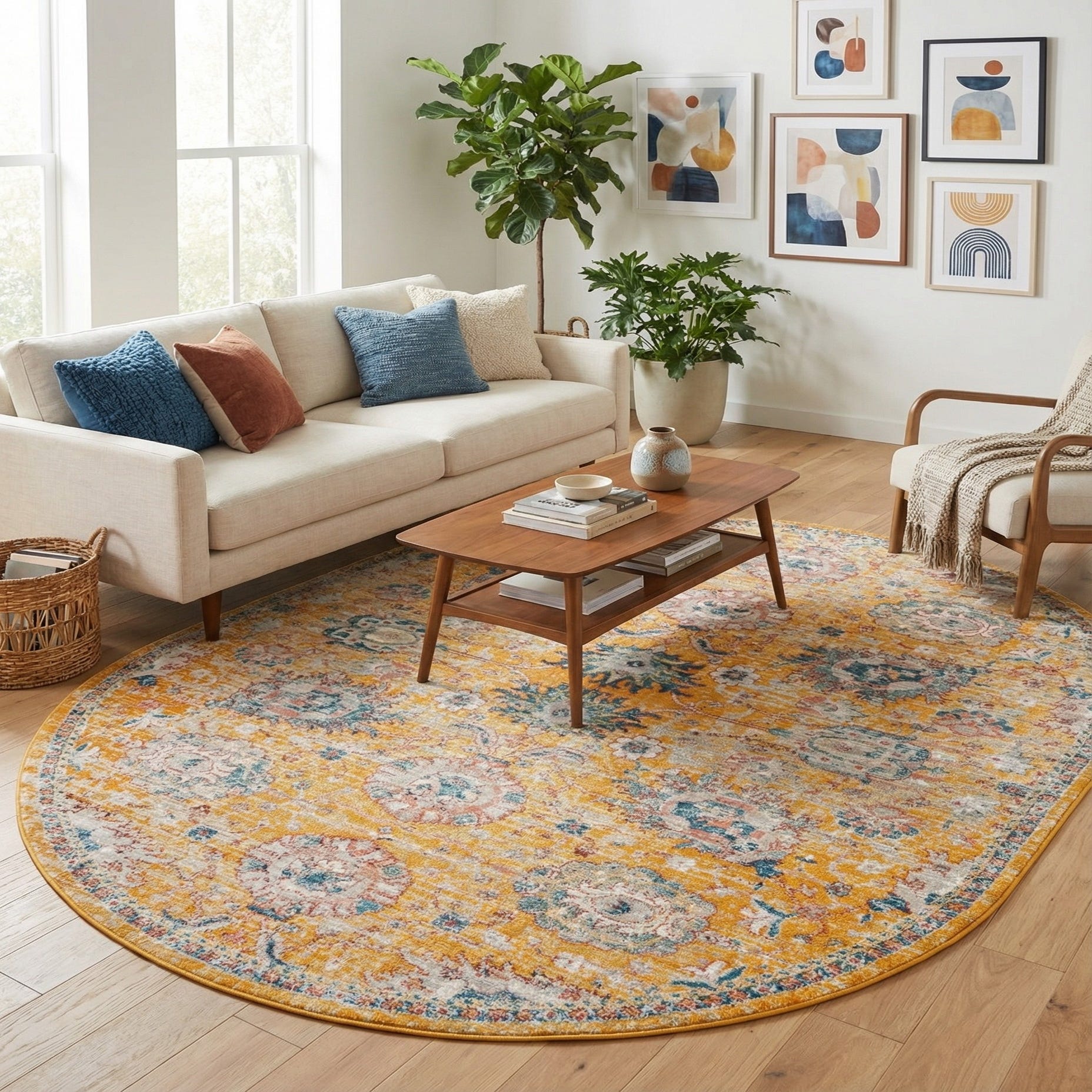 An oval yellow and gold area rug with a distressed traditional floral pattern in blue, red, and grey.