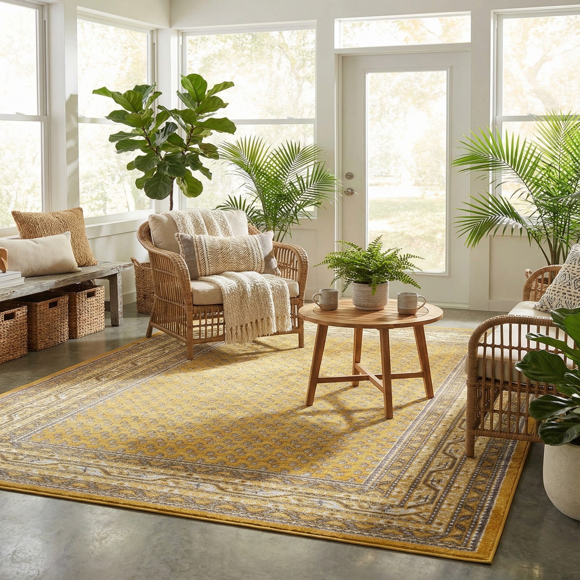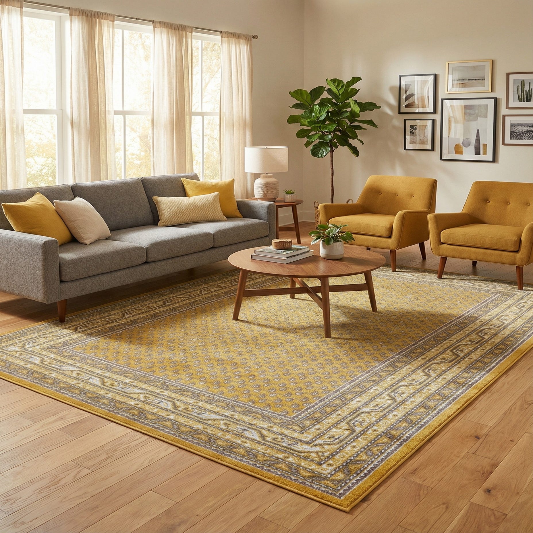 The color palette and classic design elements of this rug allow it to seamlessly integrate into interiors ranging from modern minimalist to eclectic and bohemian. It stands out beautifully against dark wood flooring, and it can serve as a focal point in living rooms, dining areas, or bedrooms with neutral or warm-toned decor. The yellow background can also complement spaces with navy accents or work as a contrast to cool gray furnishings.