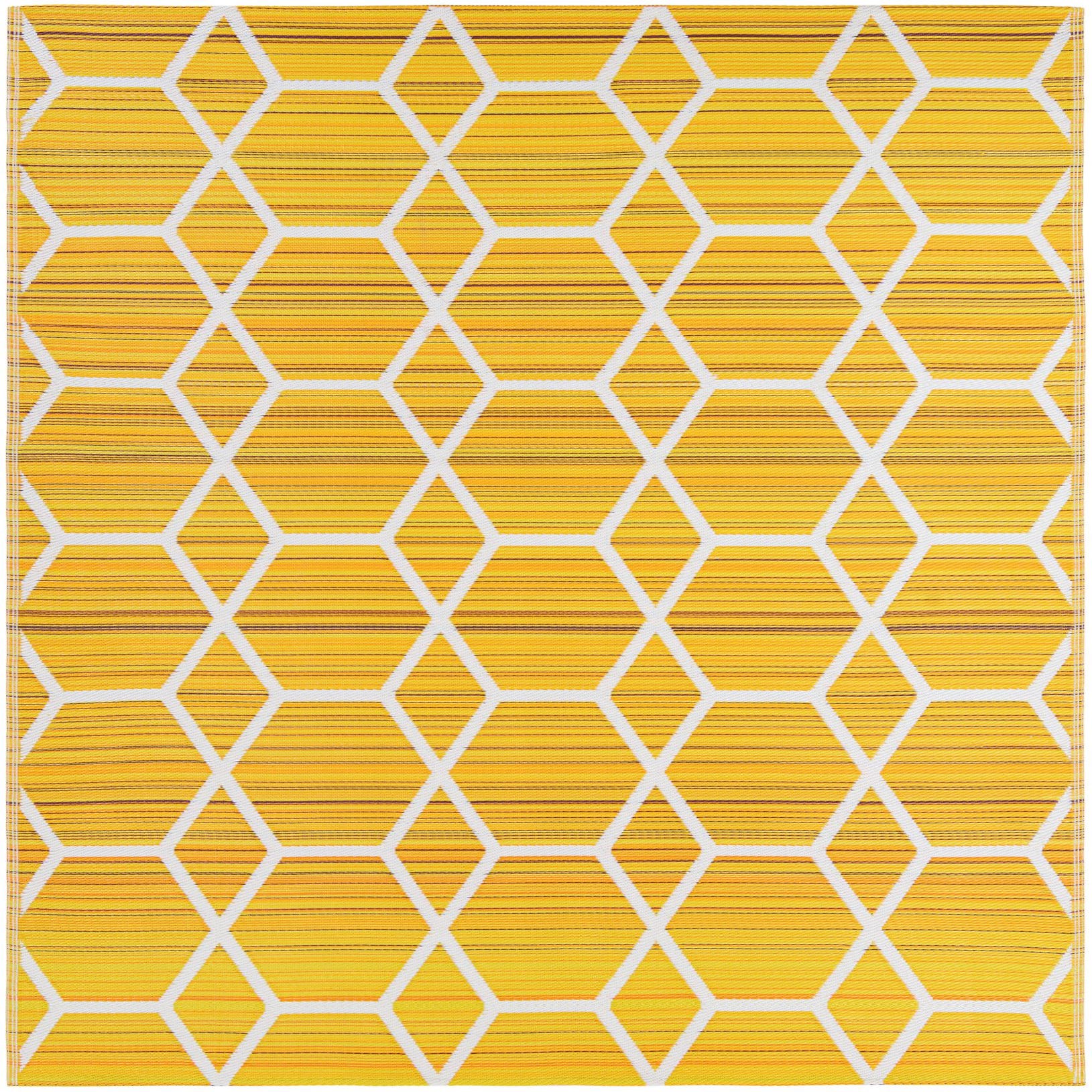 8x10 rectangular yellow and white modern geometric rug with a honeycomb pattern, suitable for indoor/outdoor use.