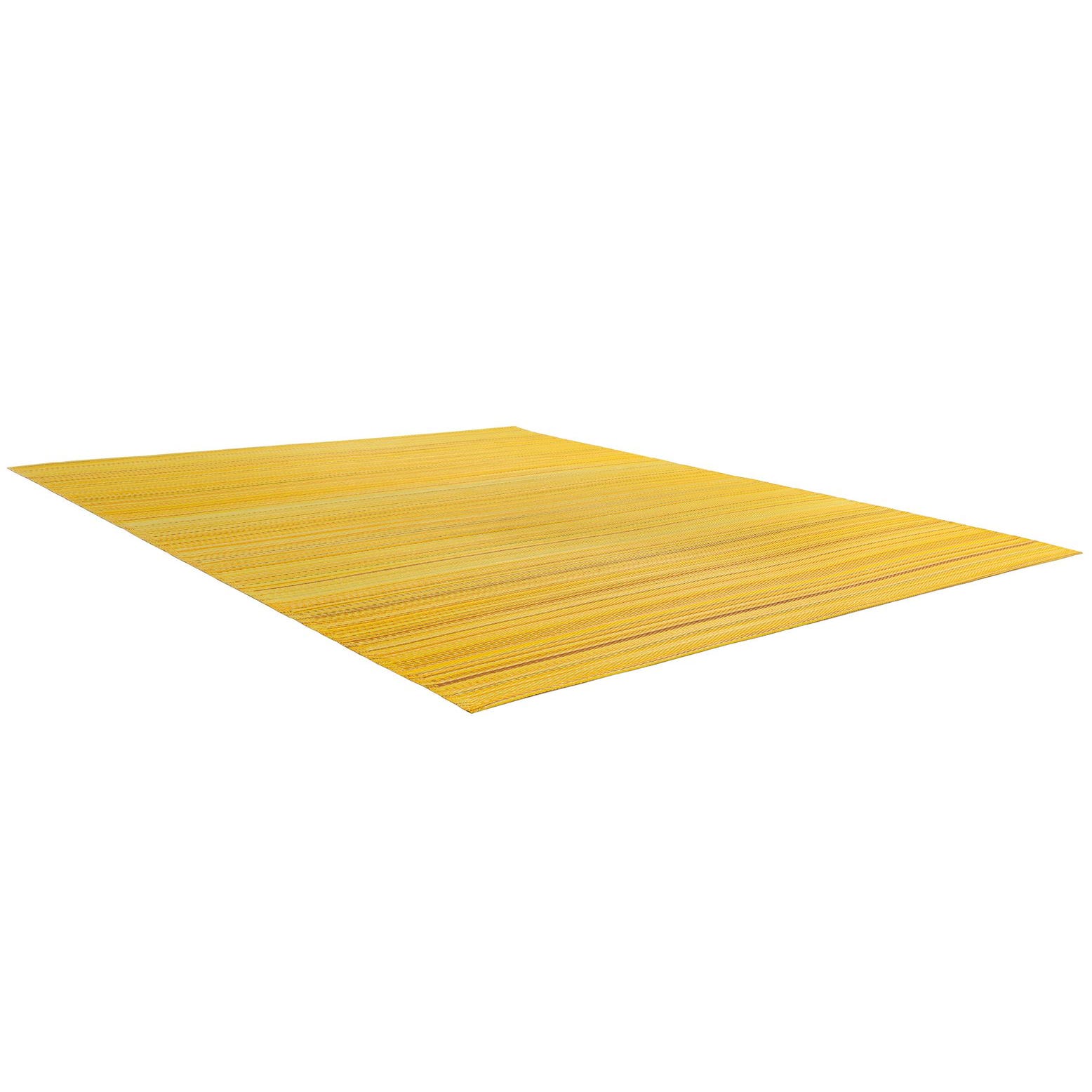 Machine made from 100% polypropylene and intended for outdoor use, this piece layers easily under dining sets or seating arrangements. It works well on a covered patio paired with rattan furniture and neutral cushions, in a bright sunroom with natural woods and leafy plants, or as a sunny anchor in a contemporary living area where clean lines and warm color are desired.