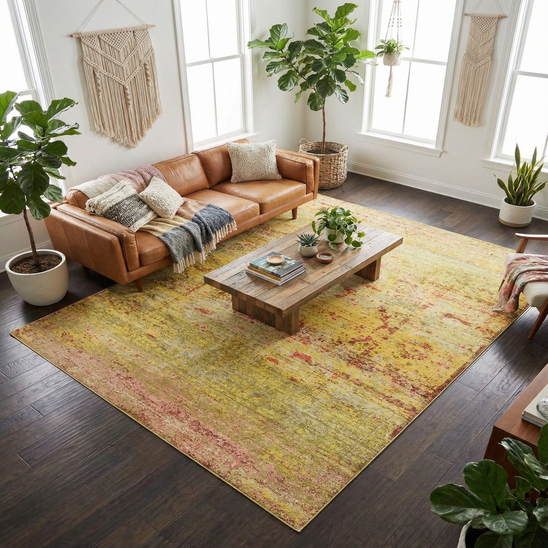 A softly distressed, vintage-inspired design gives this rug a relaxed, lived-in look with just enough pattern to catch the eye. The yellow ground sets a warm, sunlit stage while layered accents of burgundy, puce, green, gray and ivory form faded floral and medallion suggestions across the field. The motifs are gently blurred and worn back, producing a painterly, tonal effect that adds depth without dominating a room.