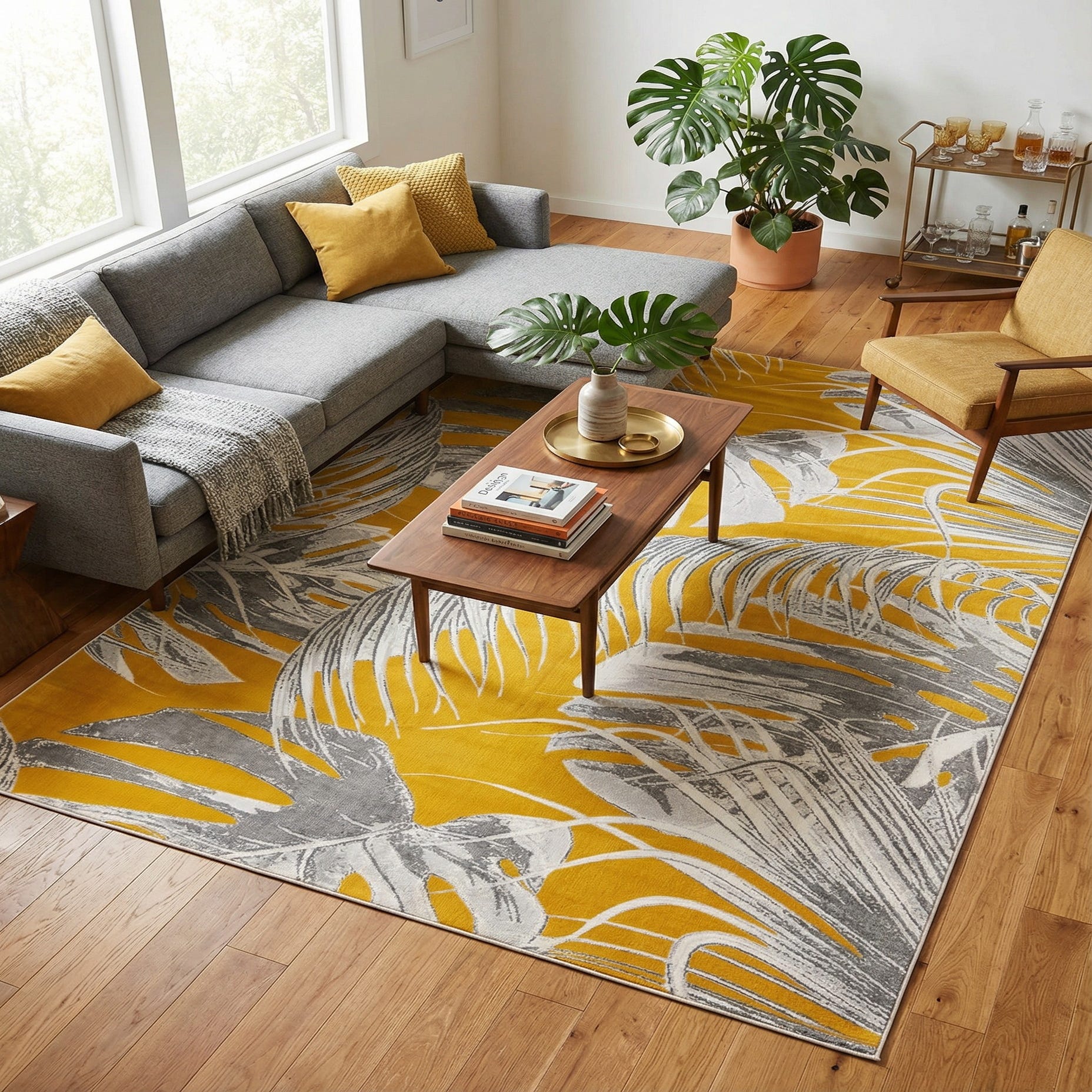 A bold, large-scale botanical pattern of overlapping palm and monstera leaves fills the field against a sunny yellow background. The leaf motifs are rendered in soft ivory and muted gray, with painterly shading and fine line work that give the design movement and depth. Machine-made from 100% polypropylene, the rug has a low-profile pile with a smooth, slightly lustrous finish that feels firm yet comfortable underfoot and holds the pattern’s crisp edges and color contrast.