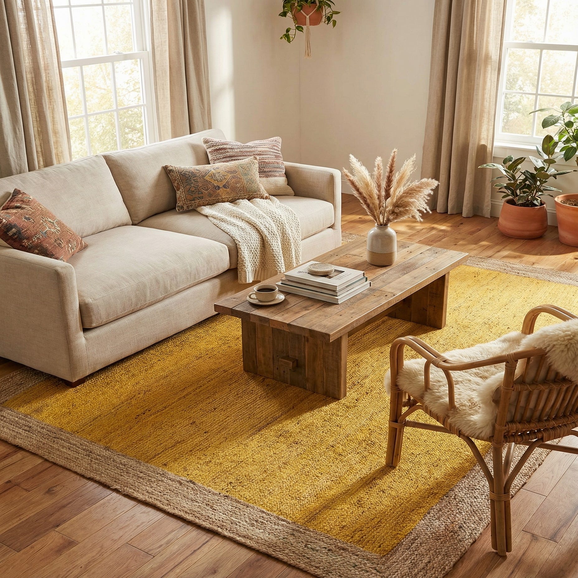 The straightforward two-tone look pairs well with casual and grounded interiors — try it beneath a wood dining table, anchored under a low-profile sofa in a sunlit living room, or layered in a breezy entry or sunroom. Combine with linen upholstery, woven baskets, leather or rattan accents, and warm wood finishes to let the yellow field brighten the space while the natural border keeps the palette balanced.