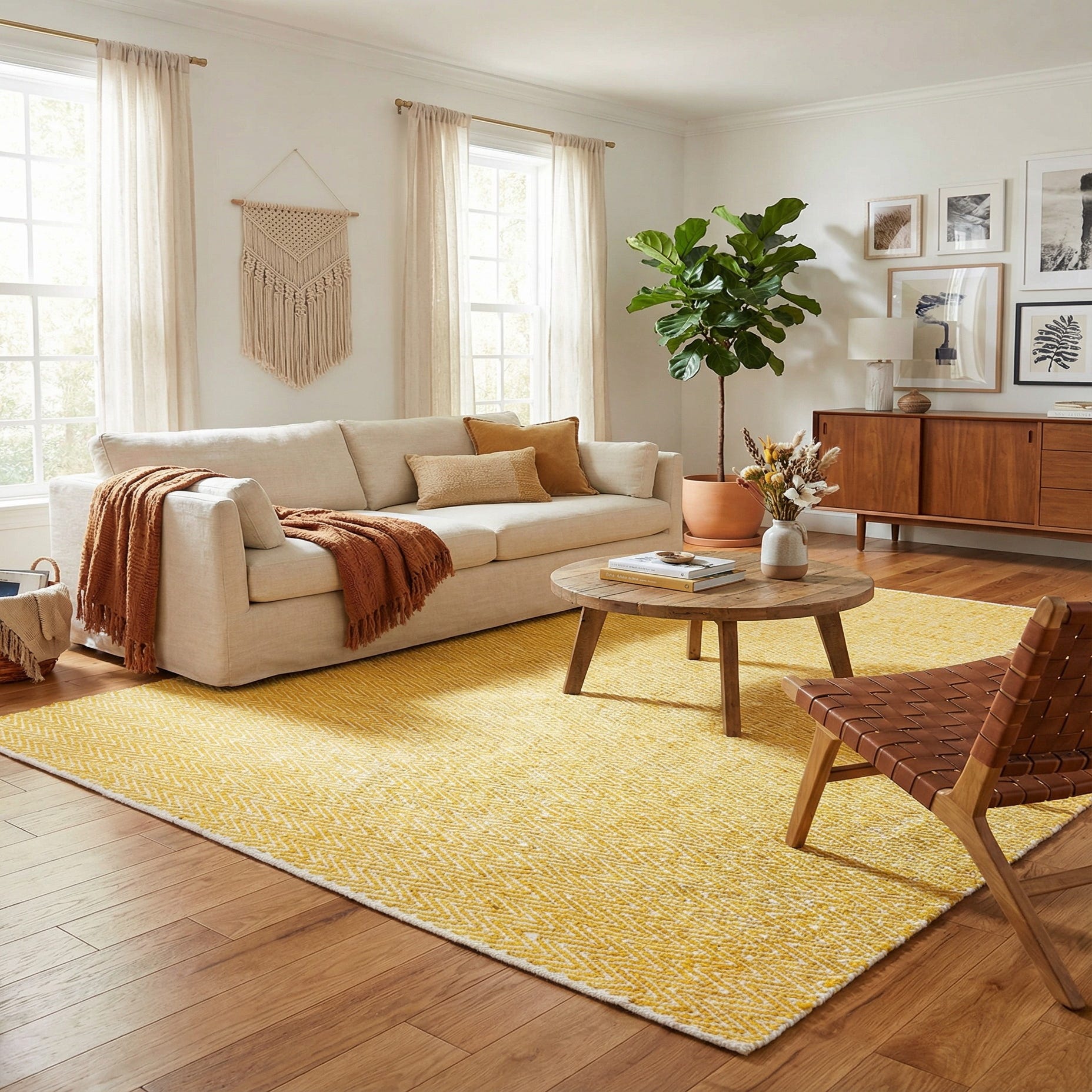 Works well in casual living rooms, sunlit dining areas, kitchens, or entryways where a touch of pattern and color is needed. Pair it with natural wood furniture, white or ivory upholstery, rattan accents, or navy textiles for a balanced palette. It also suits Scandinavian, modern farmhouse, coastal, and contemporary boho interiors—use it to anchor a seating area, define an open-plan dining spot, or layer over a larger neutral rug for added interest.