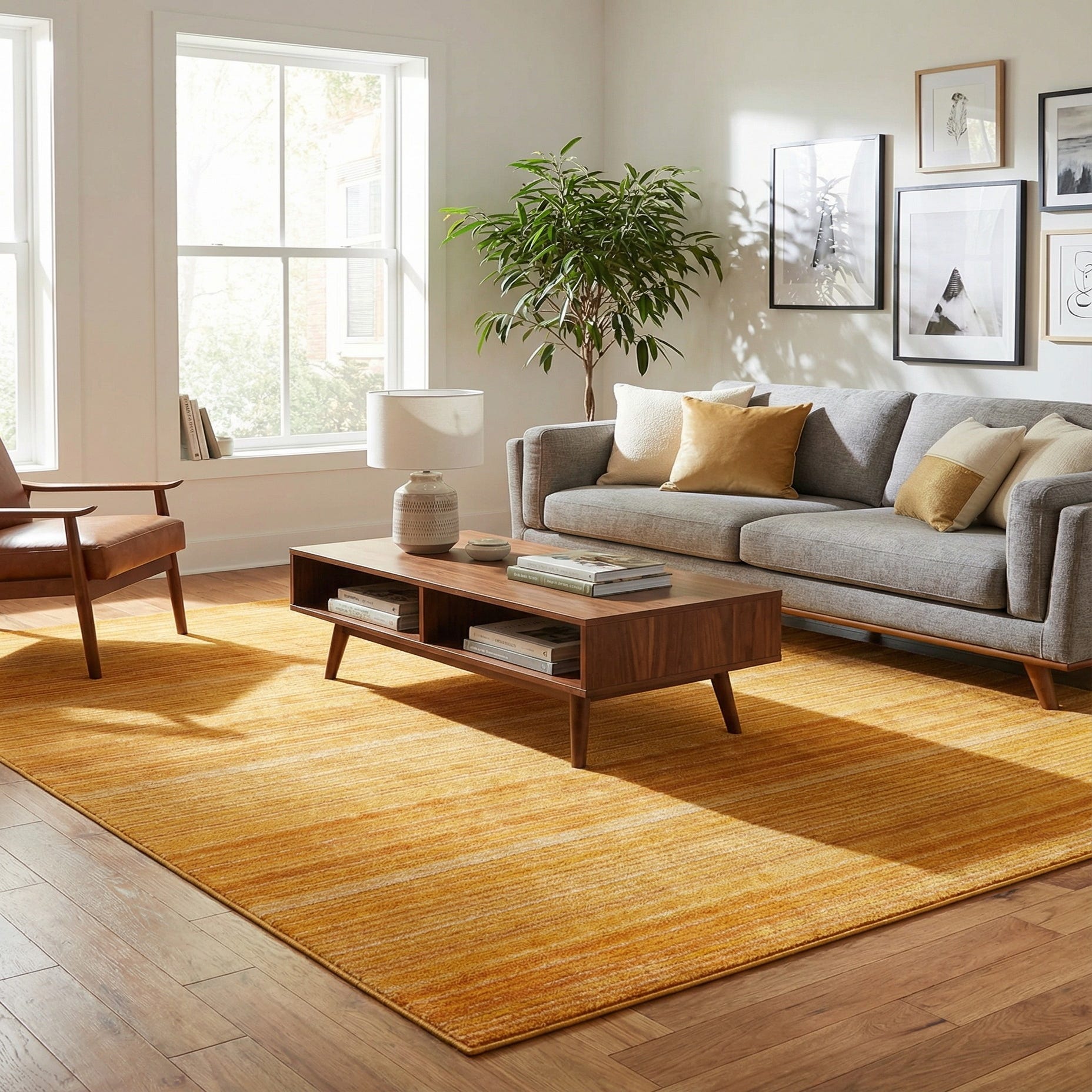 This color and pattern pair nicely with mid-century and modern furnishings — place it beneath a seating group to add warmth to a neutral palette or under a wooden dining table to soften the room. It also complements natural materials like rattan and oak or can be used to introduce a sunny accent in a minimalist bedroom or a relaxed, layered bohemian living space when combined with textured linens and deep-toned accent pieces.