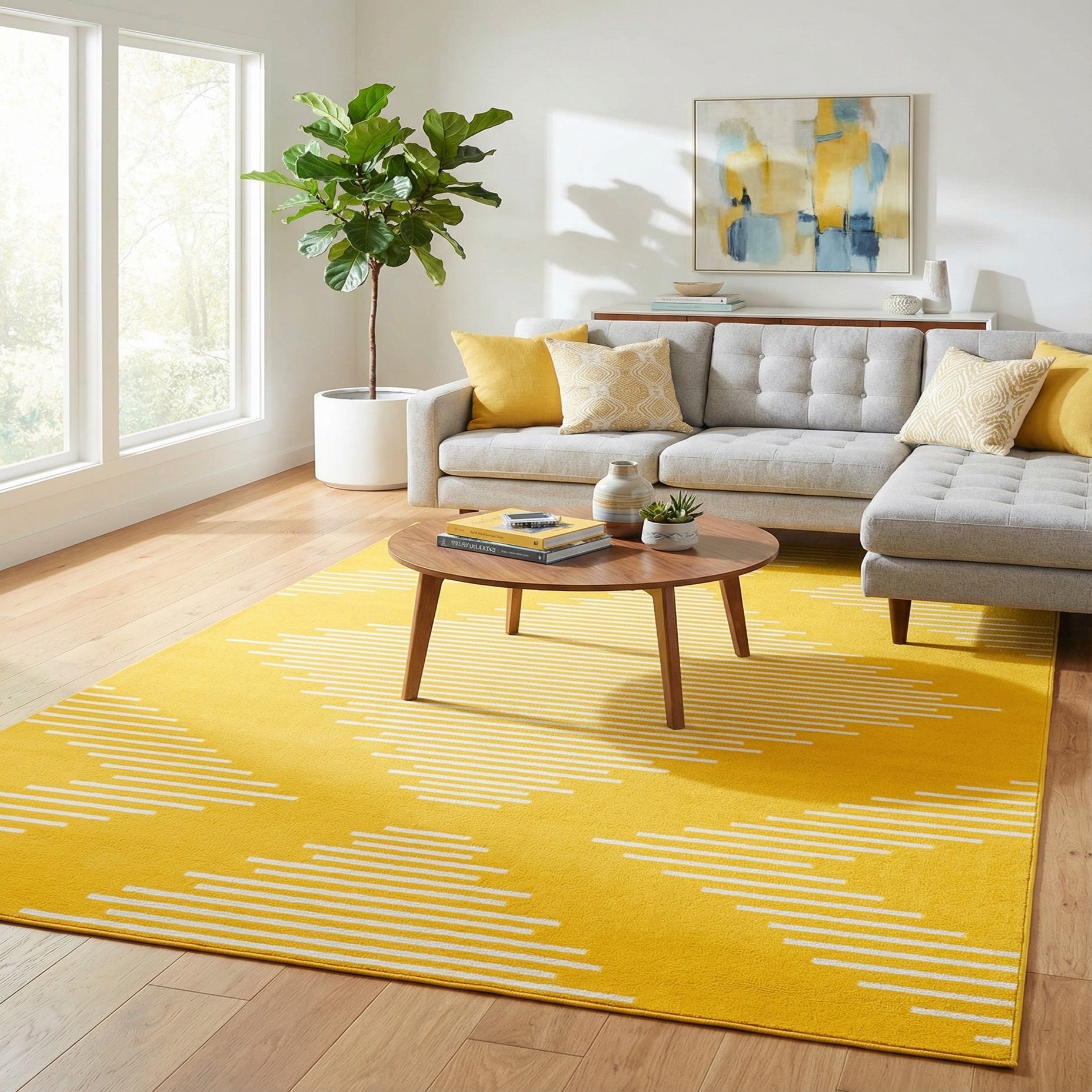 A vibrant 9x12 yellow rectangular area rug with a modern white striped diamond pattern, suitable for a living room.