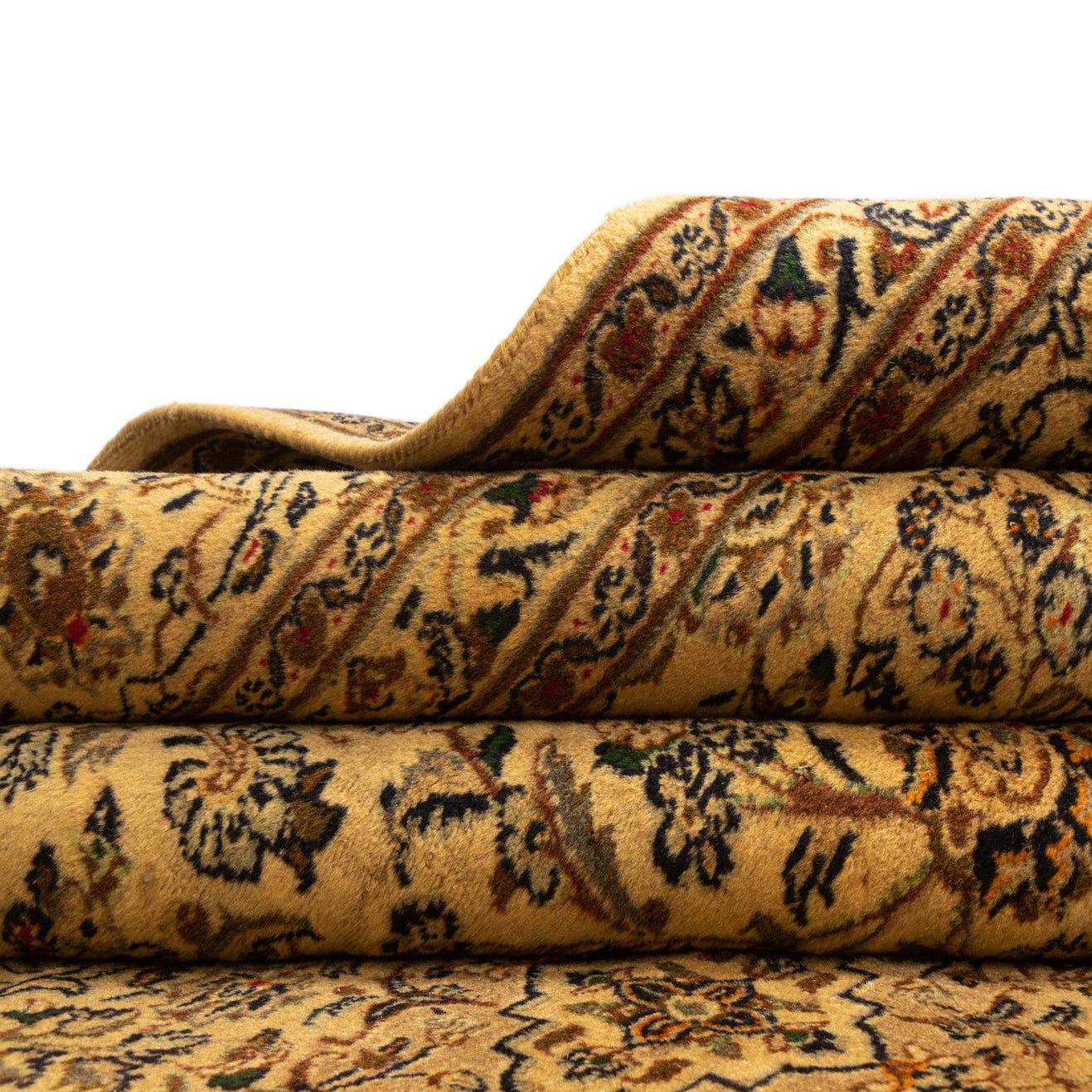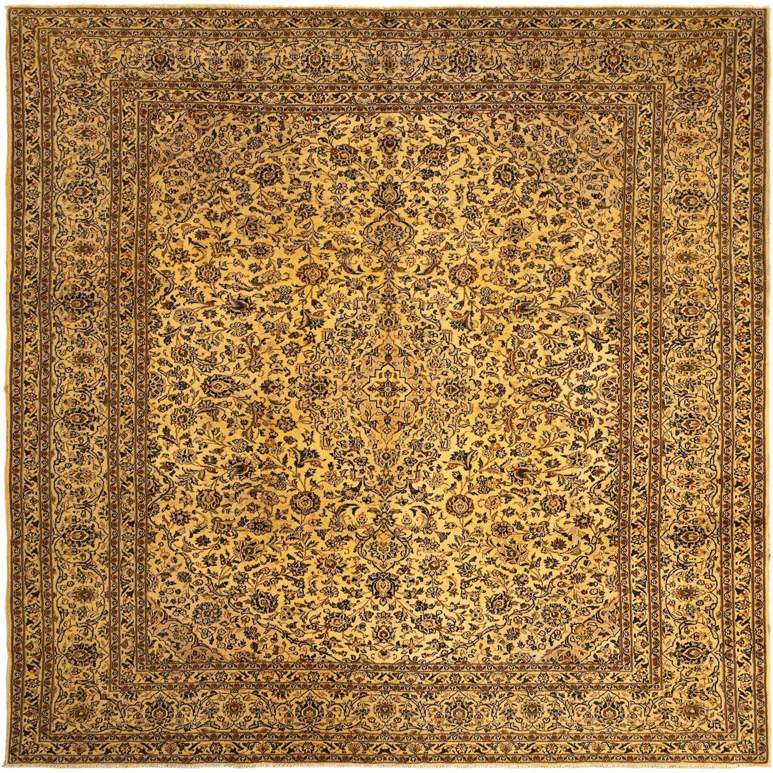 A 9x12 rectangular Kashmar Persian rug in yellow and gold, featuring intricate floral patterns and a detailed border.