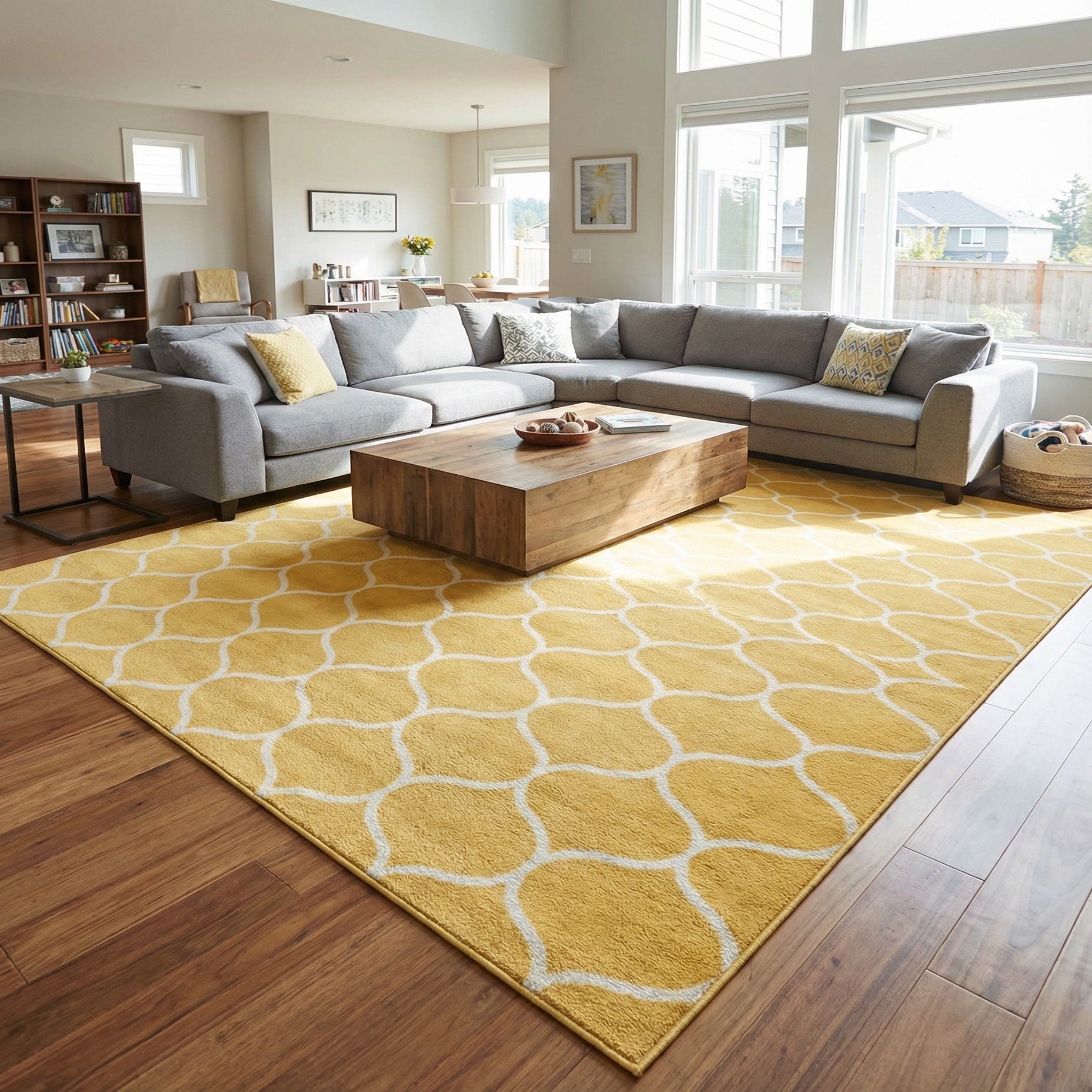 Machine-made from 100% polypropylene, this rug delivers consistent color and construction that suits everyday living. Its low profile and durable fiber make it a good choice for a living room under a coffee table, a bright breakfast nook, a child’s play area, or layered in a casual bedroom. Pair it with natural wood tones and white trim for a fresh coastal or Scandinavian look, use navy and gray accents for a modern contrast, or mix in woven textures and brass finishes for a warm, contemporary feel.