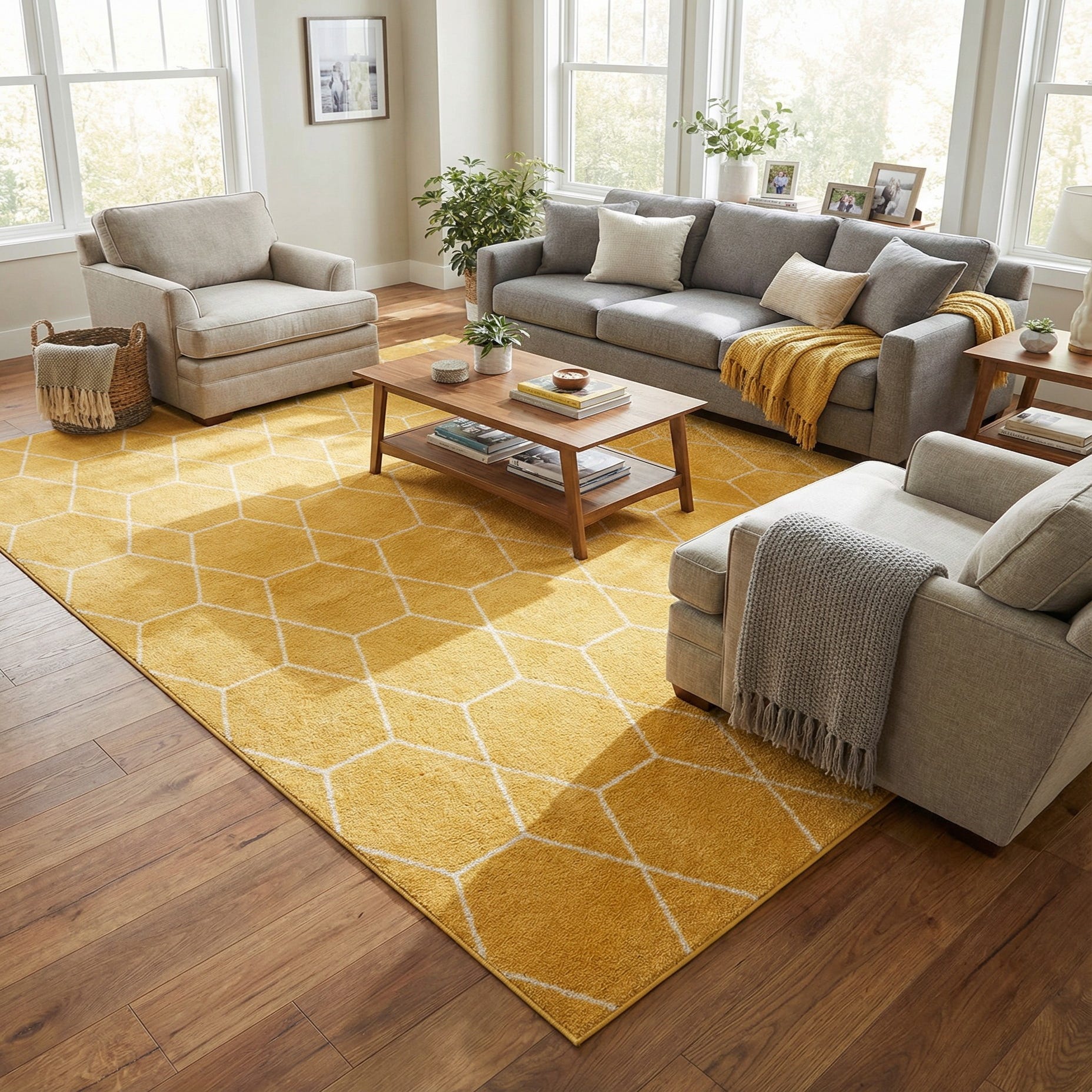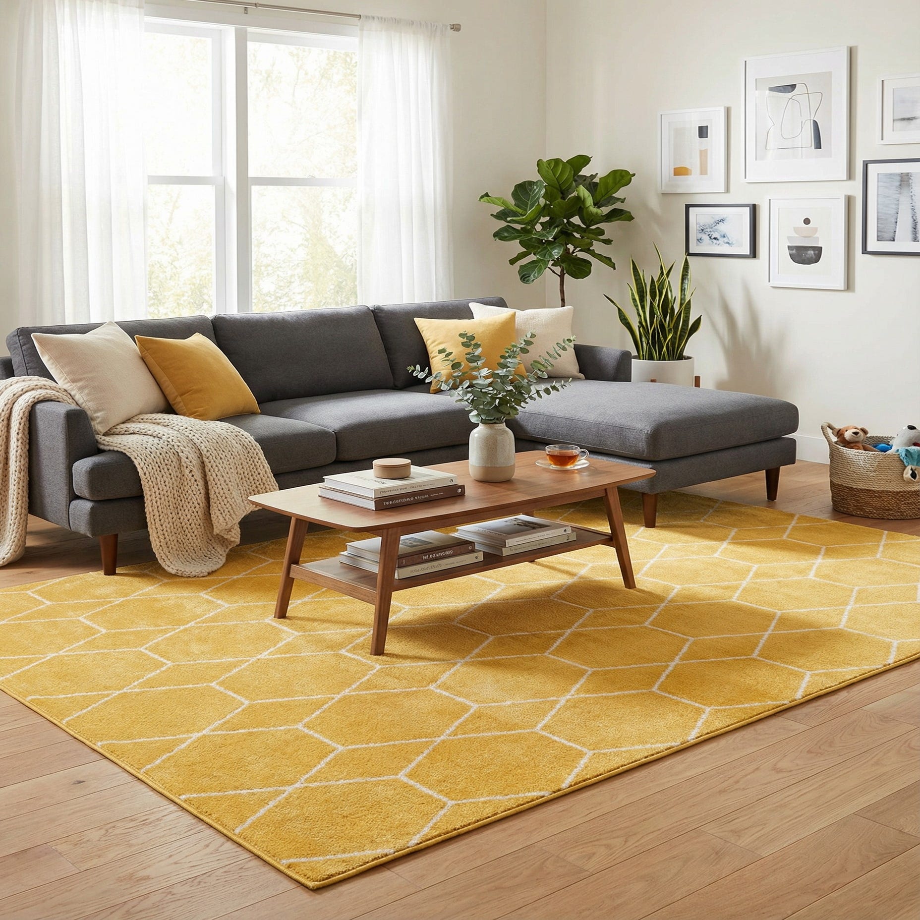 A crisp geometric lattice of ivory lines forms repeating hexagons across a warm yellow field, giving the rug a modern, honeycomb-inspired look. The pattern is clean and structured, with the ivory contrast set against the saturated yellow background to create visual depth without overwhelming the room. Machine-made from 100% polypropylene, the surface has a dense, low-profile pile that feels smooth to the touch and holds the pattern definition with a subtle, even sheen.