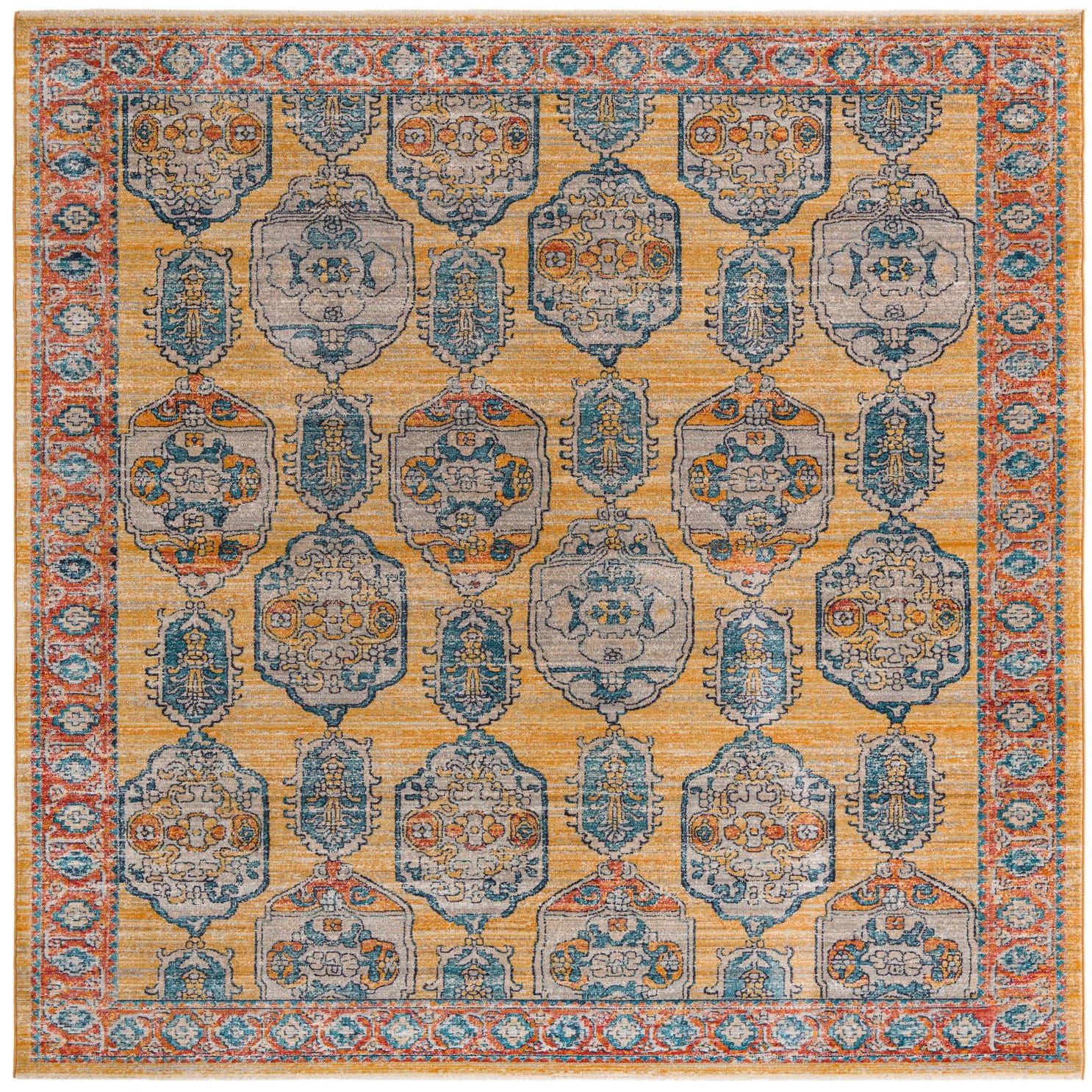 Primary color is Yellow. Colors in this rug include: Yellow, Blue, Ivory, Light Blue, Orange, Rust Red, Terracotta.