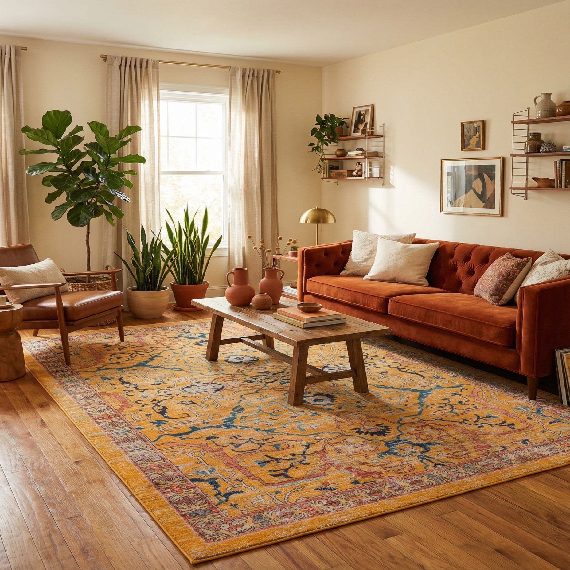 Machine-made of polypropylene, the rug has a low, dense pile that feels smooth and slightly cushioned underfoot. Place it to anchor a living room seating area beneath a neutral or navy sofa, layer it under a dining table to introduce color and pattern, or use it in a bedroom to bring warmth and contrast against light wood floors. It pairs especially well with mid-century and transitional furnishings, natural wood tones, and textiles in navy, light blue or rust-red accents for a coordinated, lived-in look.