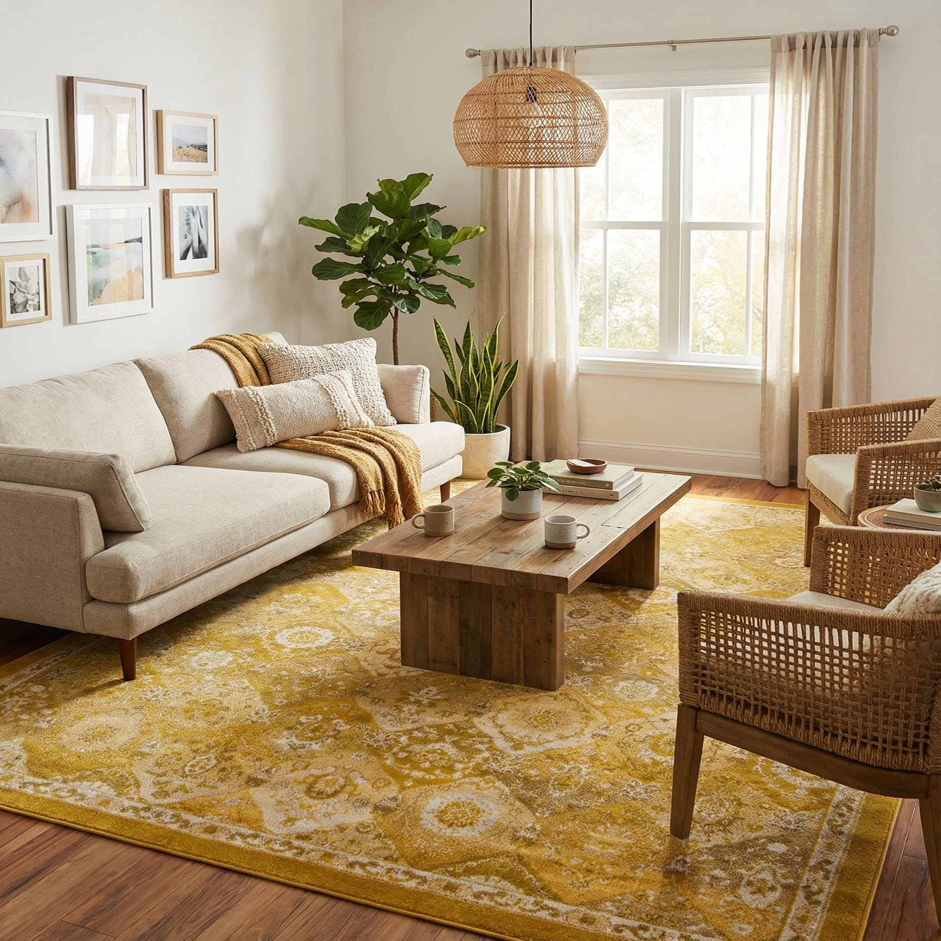 Machine made of 100% polypropylene, the rug has a consistent weave and refined texture that sits well beneath a seating group, under a dining table, or at the foot of a bed. The sunny yellow ground pairs beautifully with neutral sofas, warm wood tones, and brass or matte black accents, and it complements transitional, modern farmhouse, or mid-century interiors. Use it to bring color and pattern to a living room anchor, to warm a dining area, or to add welcoming presence in an entry or bedroom.