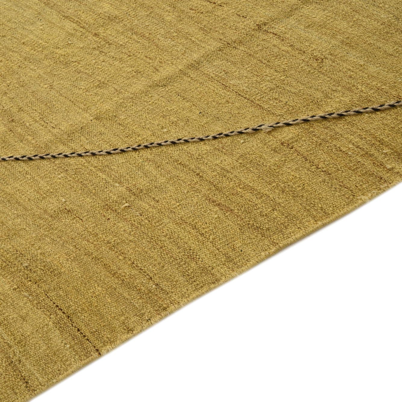 The texture of the wool contributes a natural, tactile quality to the rug, emphasizing the handcrafted nature of the piece. The yellow hue radiates warmth and can serve as a bold statement or a charismatic backdrop for various design aesthetics. Ideal for a contemporary space, this rug can also seamlessly integrate into a bohemian or eclectic setting, where its earthy tones and geometric shapes can juxtapose against a variety of textures and colors in the decor.