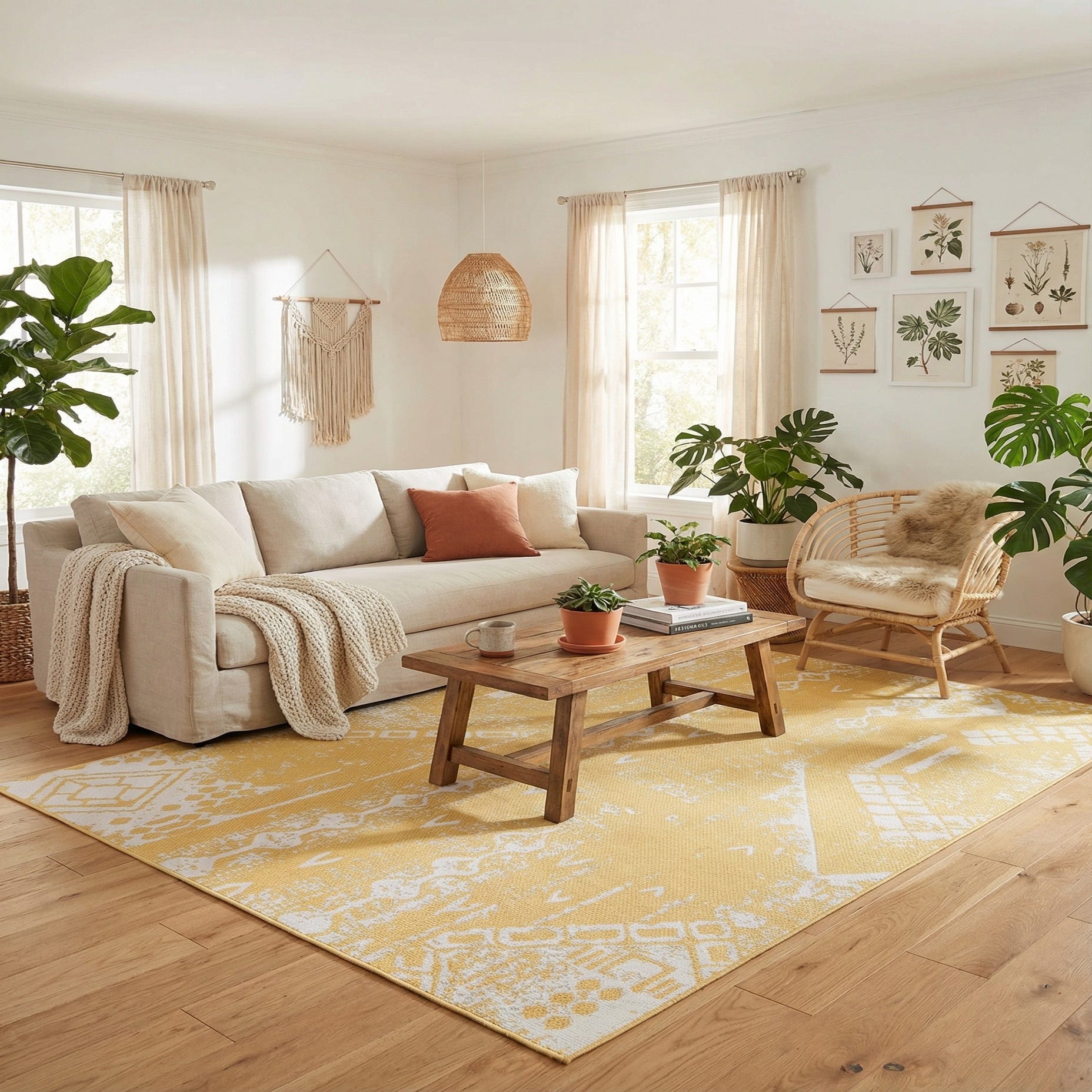 A warm yellow ground sets the tone with a relaxed, bohemian-inspired pattern in soft ivory. Geometric diamonds, slender vertical chains and abstract medallion shapes sit against a subtly distressed field, giving the design a lived-in, handwoven appearance. The layout feels balanced and airy, with the ivory motifs providing crisp contrast without overpowering the sunny background.