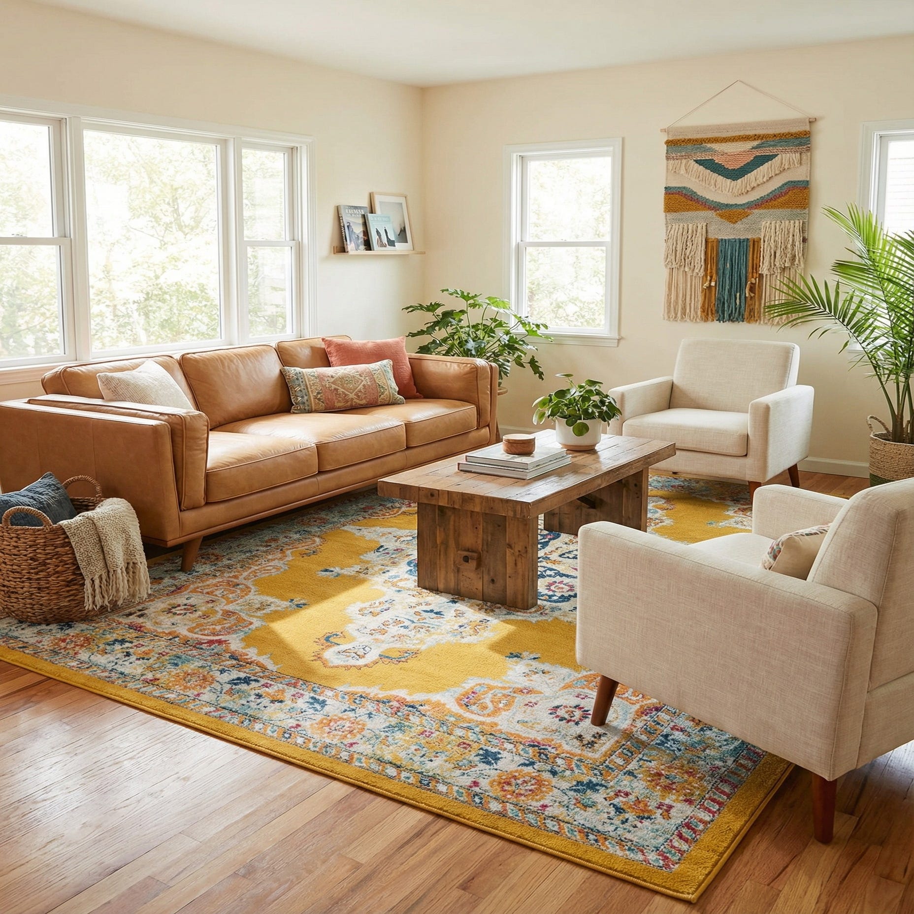 Use this piece to anchor a living room seating group or to warm a dining area with bold color and pattern. It pairs naturally with mid-century wood furnishings, eclectic bohemian layers, or contemporary neutral schemes that benefit from a strong color focal point. Add navy or olive accents and natural wood tones to tie the palette together, or place it in an entry or family room where the resilient polypropylene construction handles everyday use while the multi-hued pattern helps mask light wear.