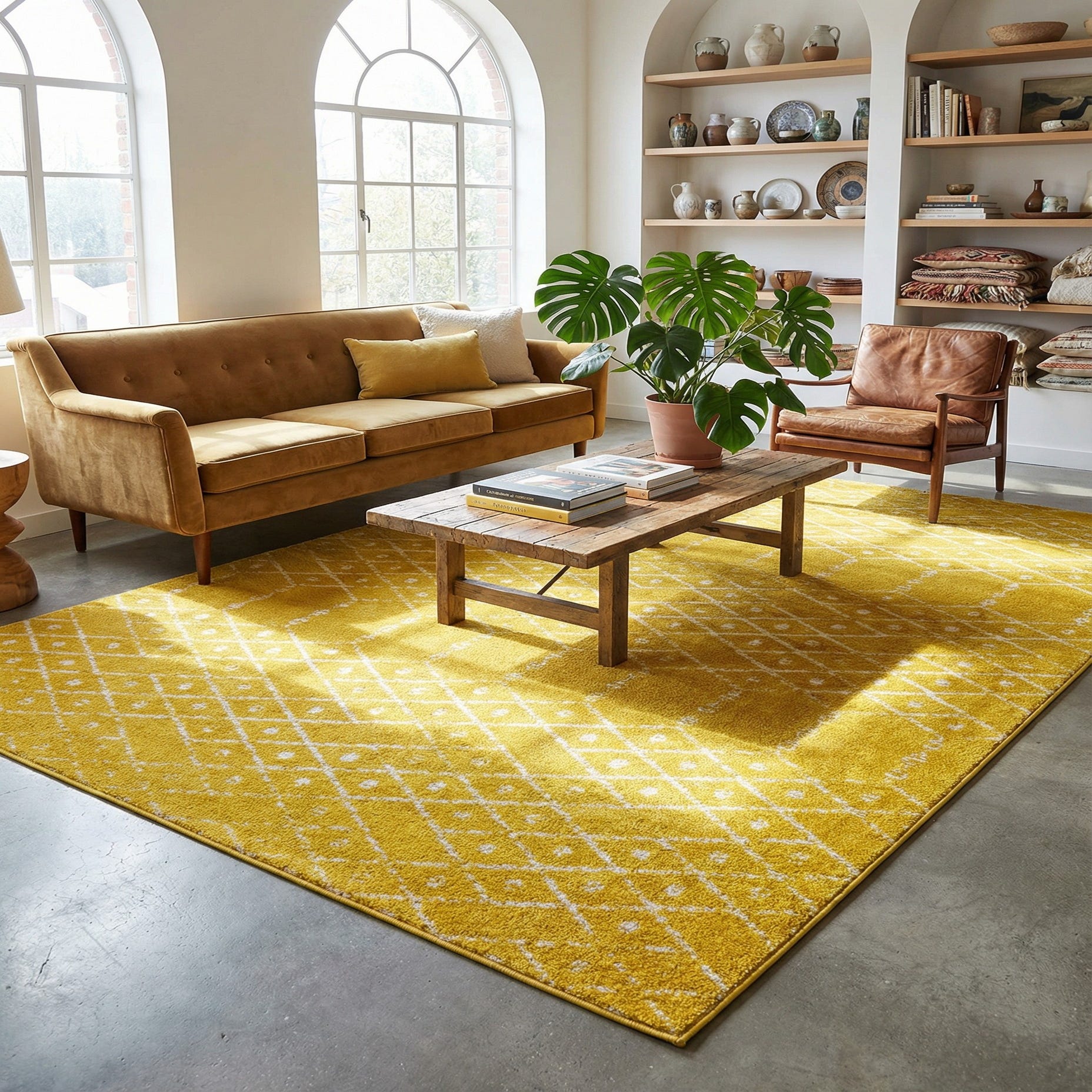 The sunny color and graphic motif bring energy to contemporary and transitional interiors alike. Use it to anchor a seating area in a living room, brighten a dining space beneath a table, or add a cheerful layer to a large bedroom. It pairs well with natural wood tones, crisp white or soft gray upholstery, and warm metal accents for a modern, yet approachable look.