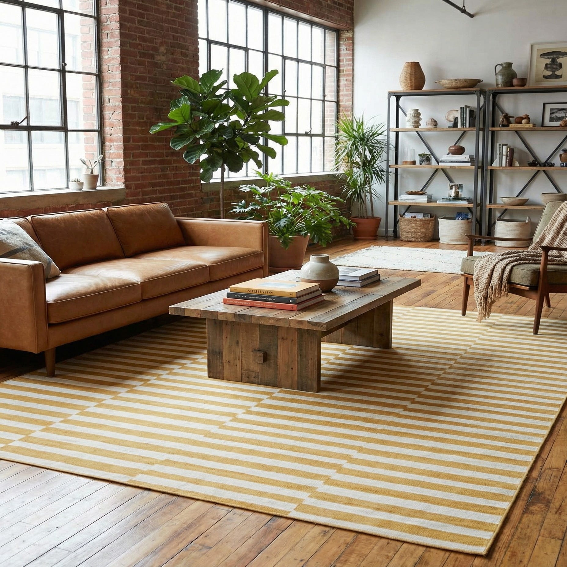 The clean, linear pattern of this rug aligns with contemporary and modern interiors, yet its simplicity allows for versatility across various decorative styles. Its sunny palette is well-suited for spaces with a neutral color scheme that could benefit from a pop of color, or for coordinating with other vibrant hues to create an engaging and lively interior. Whether placed in a living room, dining area, or open-concept space, this rug anchors the room with its crisp design and invigorating colors.