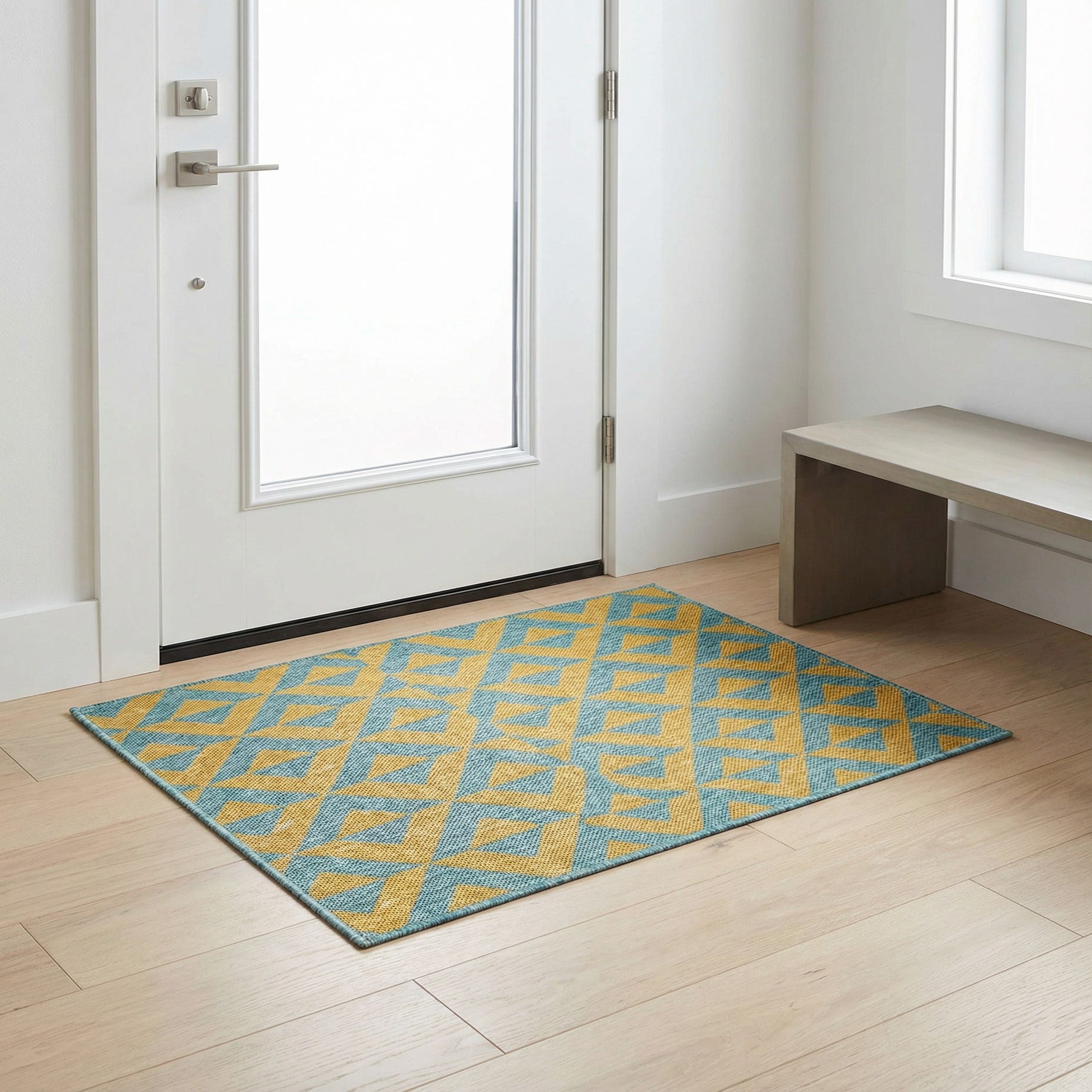From the Jill Zarin Outdoor collection, this 2x3 rug brings a vivid blend of yellow and aqua to create a bold geometric pattern that captures the eye. The design showcases a series of triangles in a dynamic arrangement, which contributes to its contemporary aesthetic. This piece's machine-woven construction of 100% polypropylene ensures it is durable, pet-friendly, and able to resist staining, making it an ideal choice for outdoor settings or high-traffic areas indoors. Its flatweave construction provides a smooth texture underfoot, and the shed-free quality enhances its practicality for everyday use.