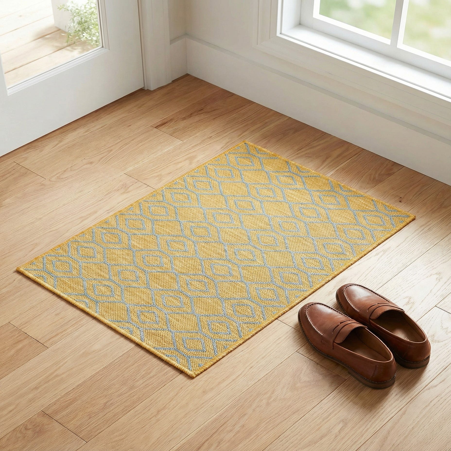 A repeating elongated diamond motif in aqua traces a rhythmic lattice across a warm yellow ground, giving the rug a lively, geometric presence. The pattern is clean and evenly scaled, with the aqua outlines providing a subtle textural contrast against the flat, low-profile weave. Machine made of 100% polypropylene, the construction feels firm underfoot with a smooth, tightly woven surface that works well both indoors and out.