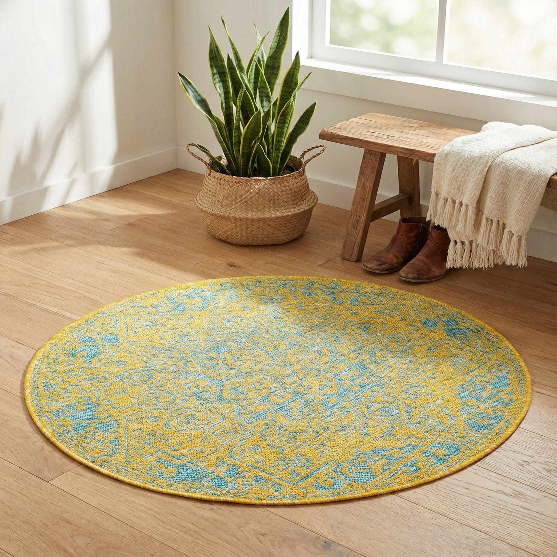 The Jill Zarin Outdoor Collection presents a versatile 3 Ft Round rug, machine woven from 100% polypropylene for enduring quality. This rug boasts a vibrant yellow and aqua color palette, lending a cheerful brightness to any outdoor space. Its pattern displays a tasteful interpretation of traditional motifs, offering a timeless elegance with a refreshing, modern color scheme.