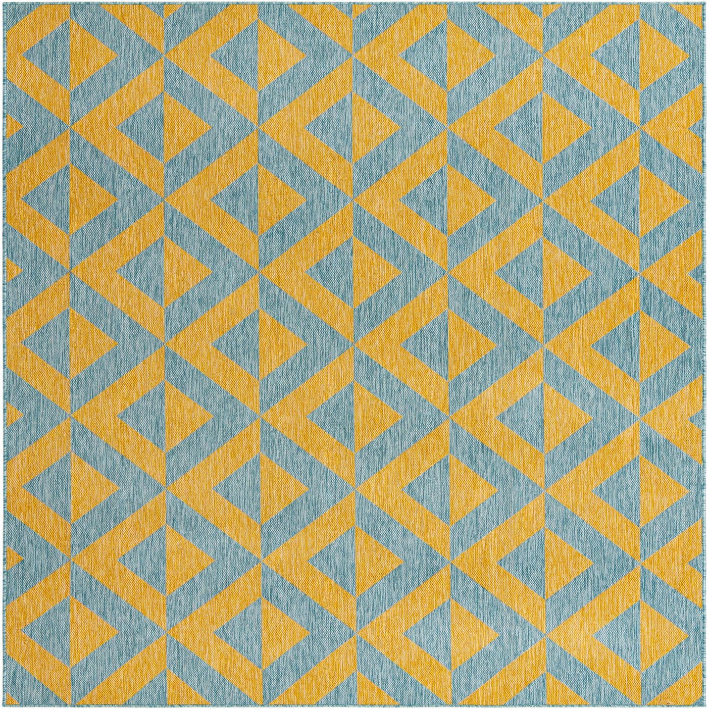 The Jill Zarin Outdoor collection offers a vibrant and dynamic rug, sized at a versatile 8x10, that is ideal for enhancing outdoor living areas. Machine woven from 100% polypropylene, this piece is crafted for durability and ease of maintenance. The rug showcases a striking geometric pattern with a balanced interplay of yellow and aqua hues set against a flatweave construction that offers a smooth texture underfoot.