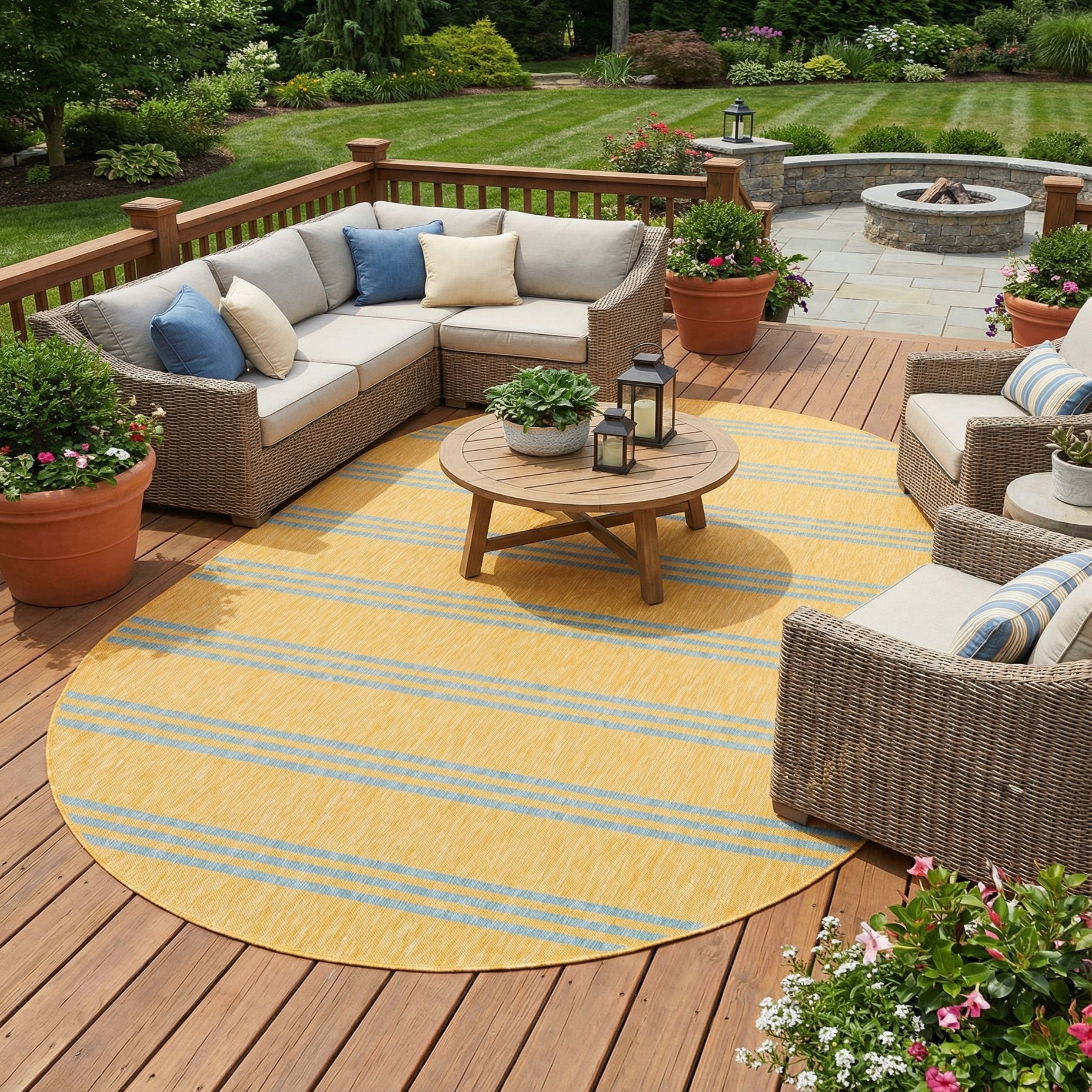 A clean, casual stripe design balances bright color with a restrained layout. Set on a warm yellow ground, evenly spaced bands of triple aqua lines run horizontally across the oval field, creating a relaxed, nautical feel without visual clutter. The surface reads as a low-profile, flatwoven texture with a subtly heathered yellow that adds depth, while the aqua stripes provide crisp contrast that draws the eye across the room. This piece is machine made from 100% polypropylene and has a smooth, tightly woven hand.