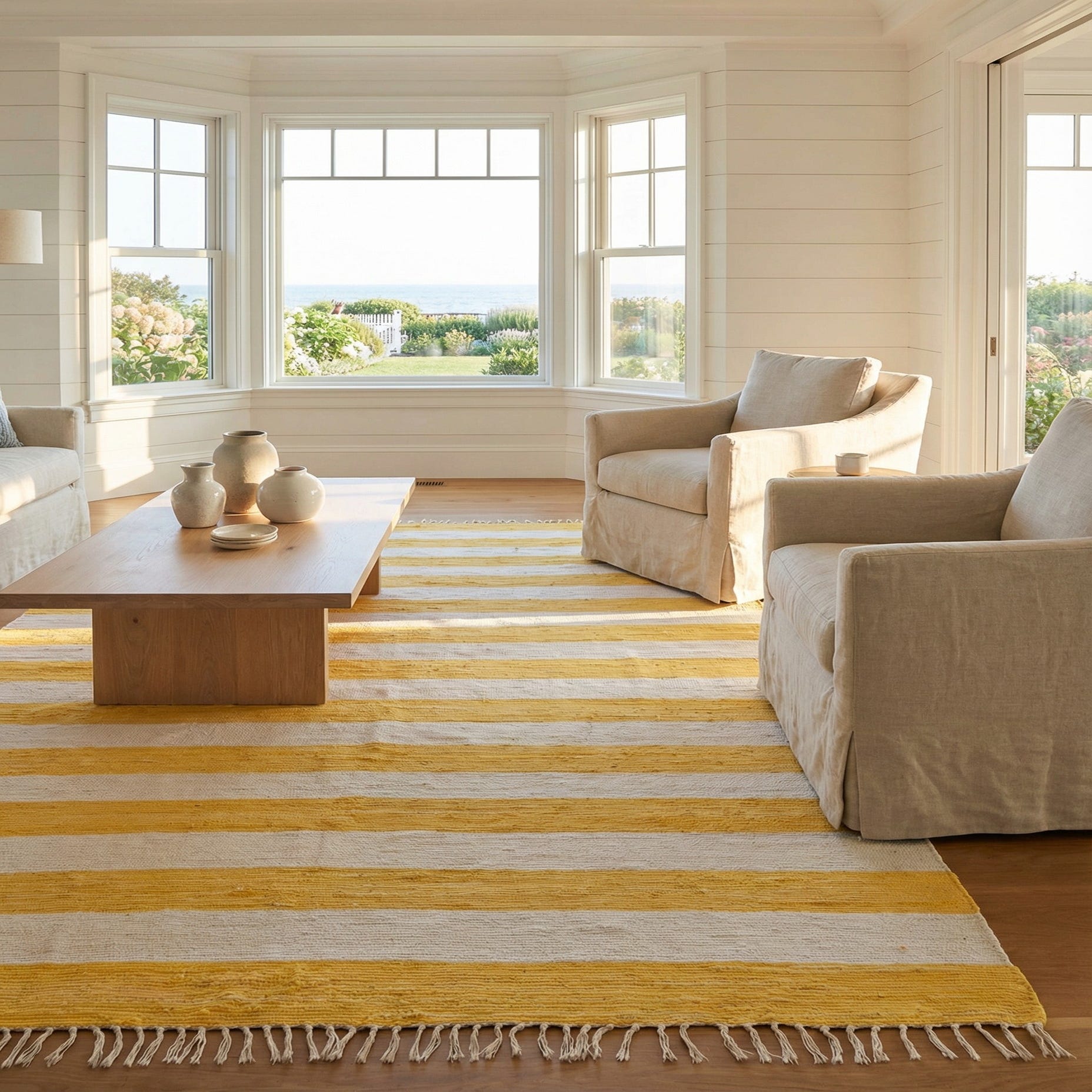 A classic banded stripe in warm yellow and soft ivory gives this hand-woven cotton rug a fresh, casual look. The flatweave construction and visible slubs in the cotton create a gently textured surface that feels soft underfoot while remaining low-profile. Narrow fringes at the short ends add a relaxed finishing detail, and the handwoven stripes display small variations in width that reinforce the rug’s handcrafted character.
