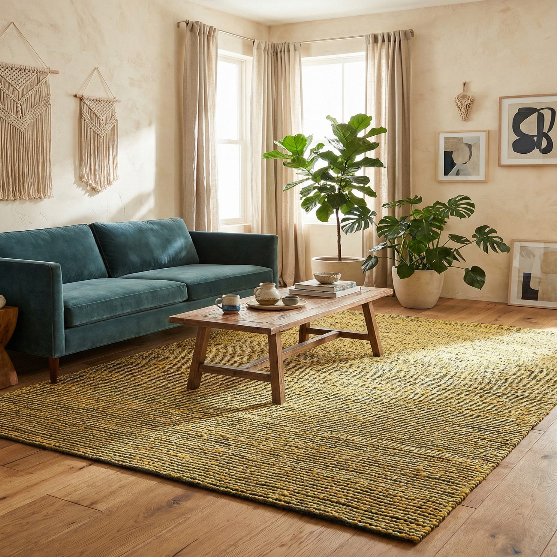 This rug works well in casual coastal, modern farmhouse, or contemporary coastal interiors; pair it with natural oak or driftwood furniture and linen upholstery to highlight the organic texture, or layer it beneath a simple sofa and coffee table to ground a seating area. It also suits a bright entryway, sunroom, or kitchen dining nook where the navy and yellow palette can tie together navy accents, brass hardware, or muted white walls for a fresh, lived-in look.