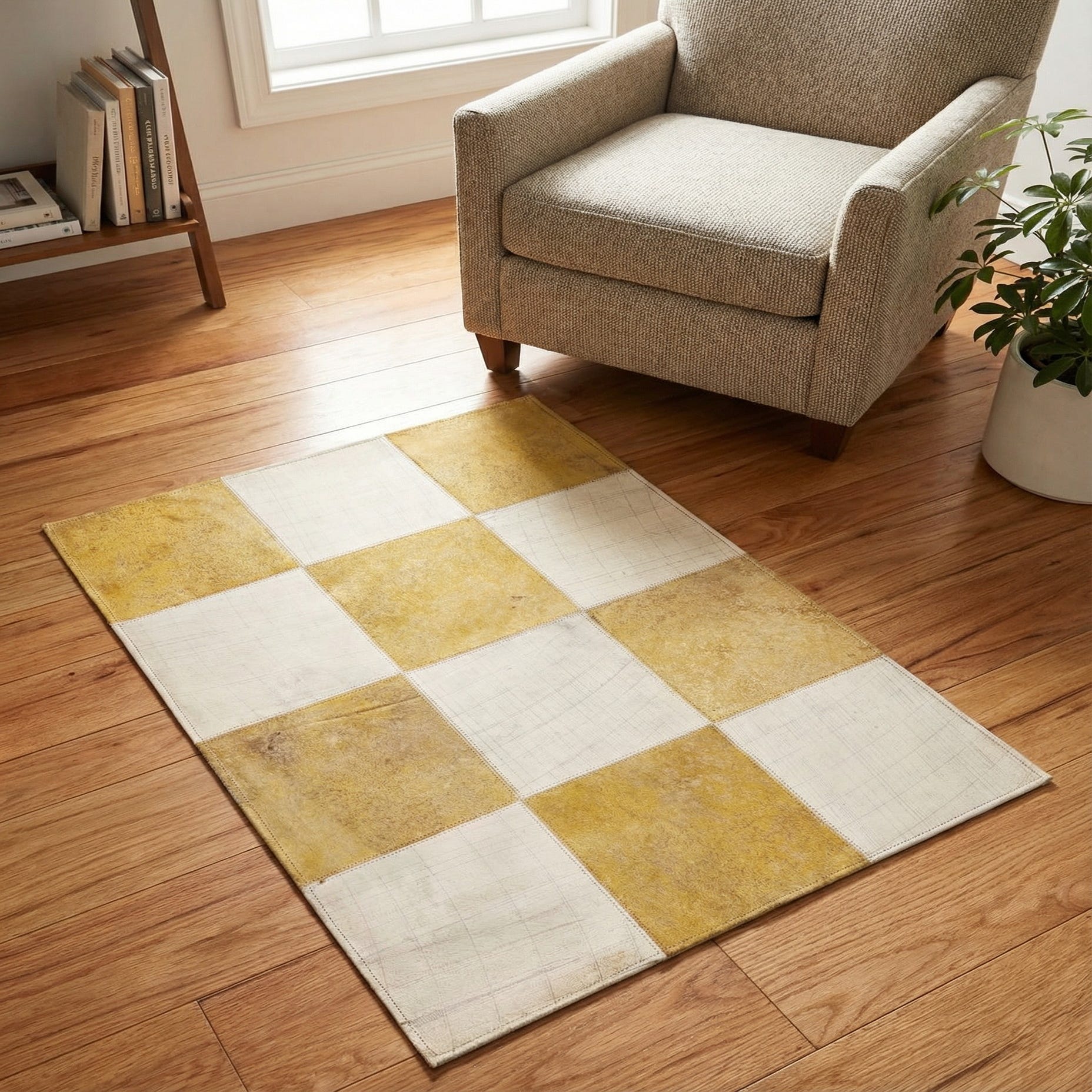 Colors displayed in this rug are yellow and white with interspersed touches of gold, arranged in a simple yet elegant grid pattern. The dual-toned squares create a harmonious balance, making this rug a versatile addition to various decor settings. Suitable for an array of interior design scenarios, this piece would complement minimalist or modern aesthetics, adding a touch of organic warmth to spaces with sleek lines and neutral color palettes. It can also serve as a unique statement piece in eclectic settings or as a textural counterpoint in Scandinavian-inspired interiors.