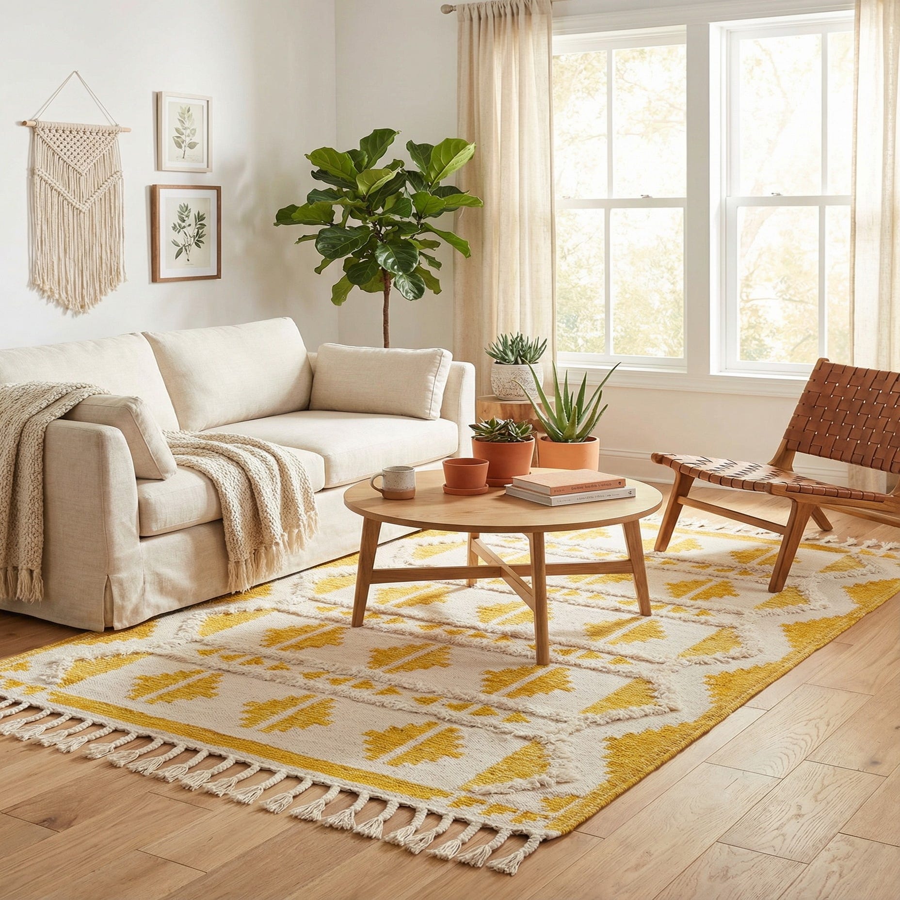 A 5x8 rectangular yellow and white tribal shag rug with geometric patterns and fringe.