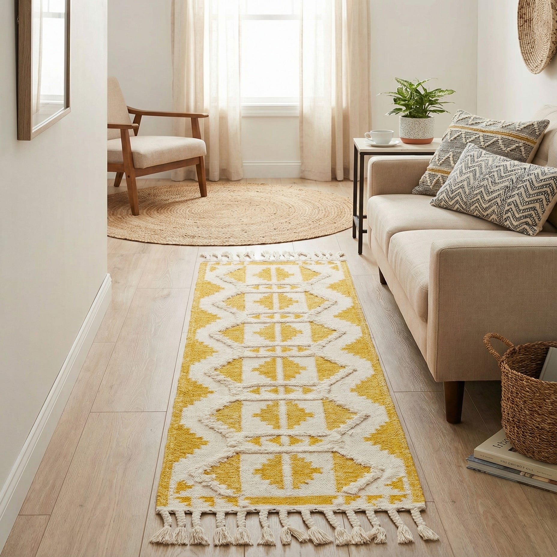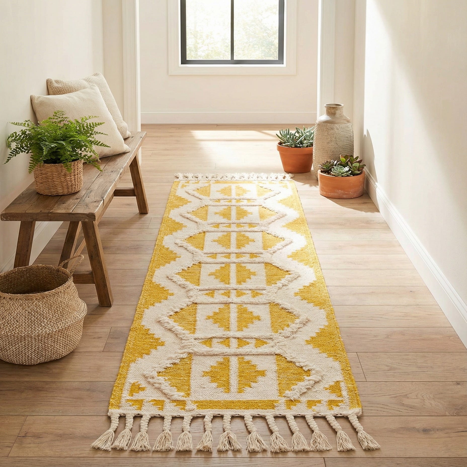 A warm, geometric runner with a bright yellow and white palette, this hand-woven 100% wool rug pairs clear, repeating medallions with stepped diamond and triangle accents for a graphic, balanced look. The construction combines a firm flat weave with raised, knotted motifs that create a tactile contrast—run your hand across the surface and feel the subtle lift of the textured pattern against the smoother background. Braided fringe at each end adds a casual finishing touch.
