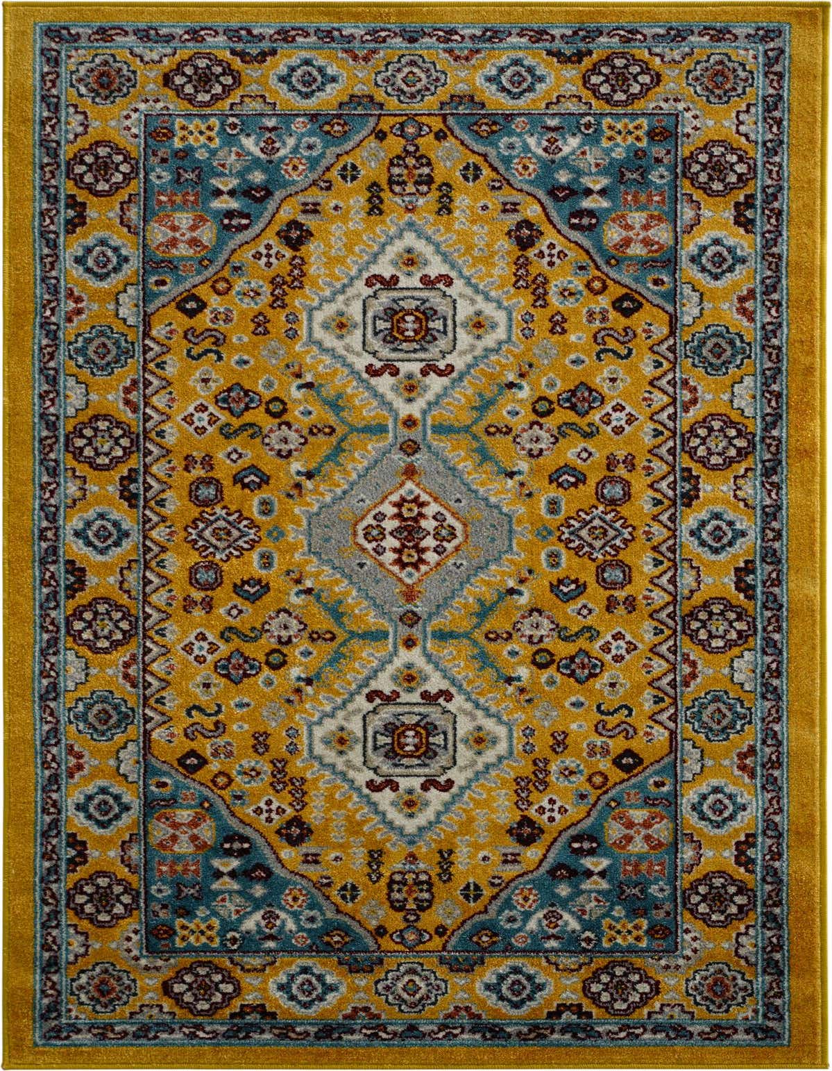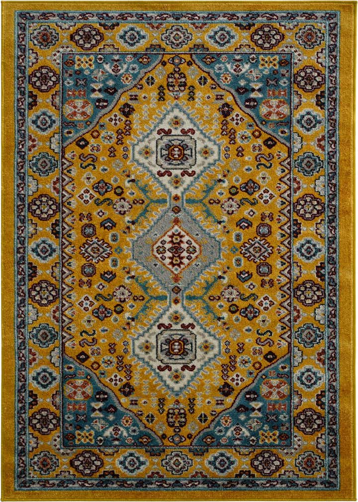 Primary color is Yellow Gold. Colors in this rug include: Yellow Gold, Ivory, Red, Gray, Light Blue.