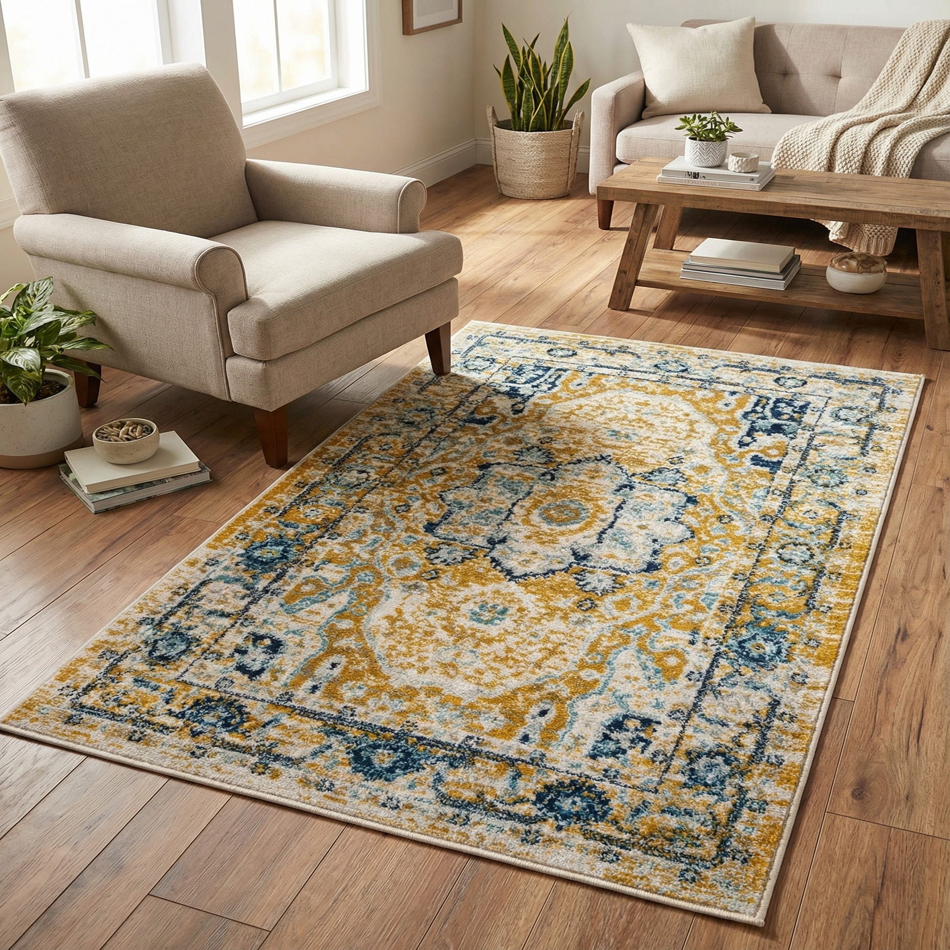 Primary color is Yellow Gold. Colors in this rug include: Yellow Gold, Ivory, Light Blue, Navy Blue, Teal.